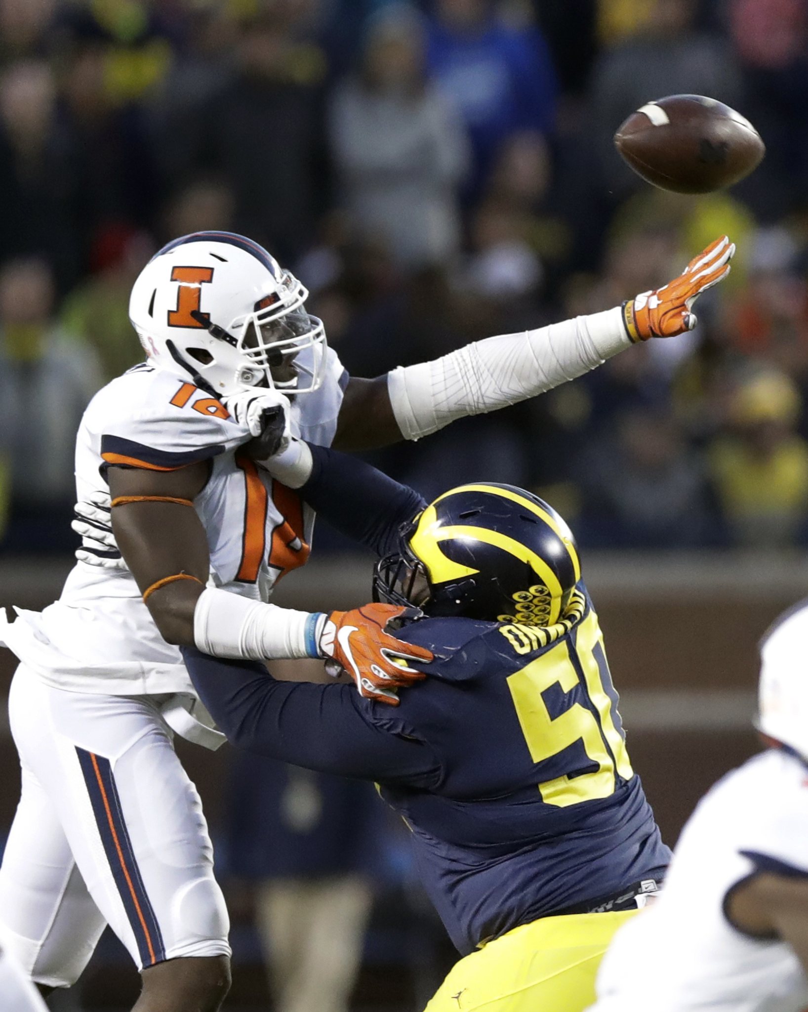 Illinois defensive lineman Gimel President tries blocking a pass while pushed by Michigan offensive lineman Michael Onwenu (50) during the second half of an NCAA college football game, Saturday, Oct. 22, 2016, in Ann Arbor, Mich. (AP Photo/Carlos Osorio)