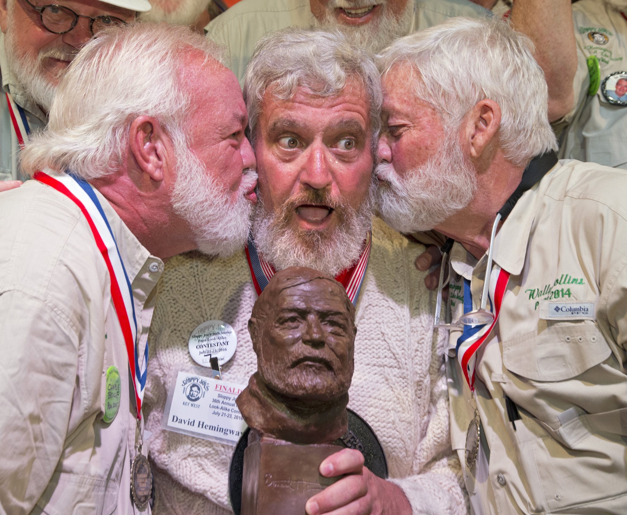 Dave Hemingway, center, receives smooches from Charlie Boise, left, and Wally Collins after winning the 2016 Ernest “Papa” Hemingway Look-Alike Contest Saturday in Key West, Fla. (Associated Press)