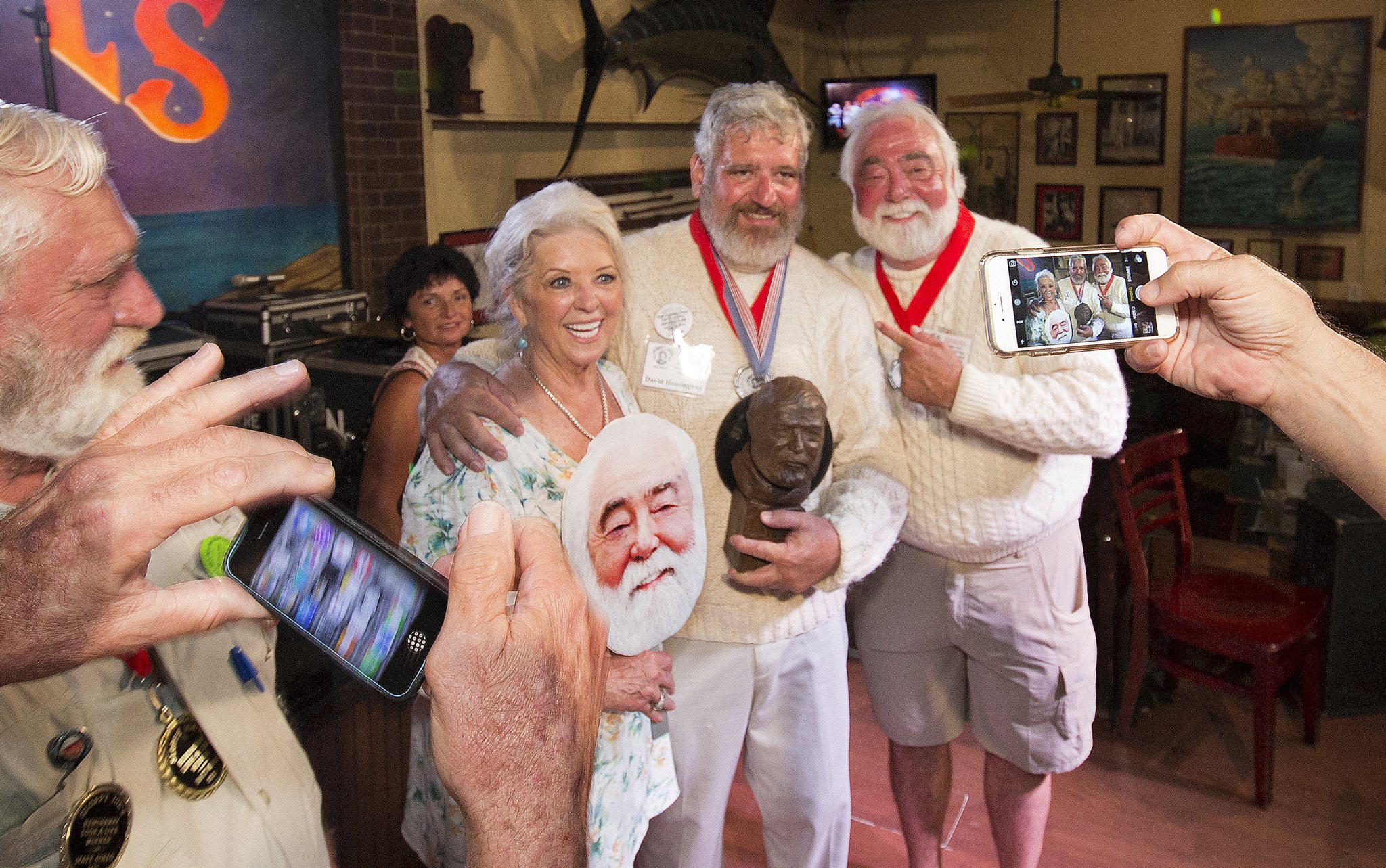 In this Saturday, July 23, 2016 photo provided by the Florida Keys News Bureau, Dave Hemingway, center, poses for smartphone photos with celebrity chef Paula Deen, left, and her husband Michael Groover, right, after Dave Hemingway won the 2016 Ernest "Papa" Hemingway Look-Alike Contest at Sloppy Joe's Bar in Key West, Fla. Success for David Hemingway came on the Macon, N.C., resident's seventh attempt. He is not related to Ernest Hemingway who lived and wrote in Key West in the 1930s. (Rob O'Neal/Florida Keys News Bureau via AP)