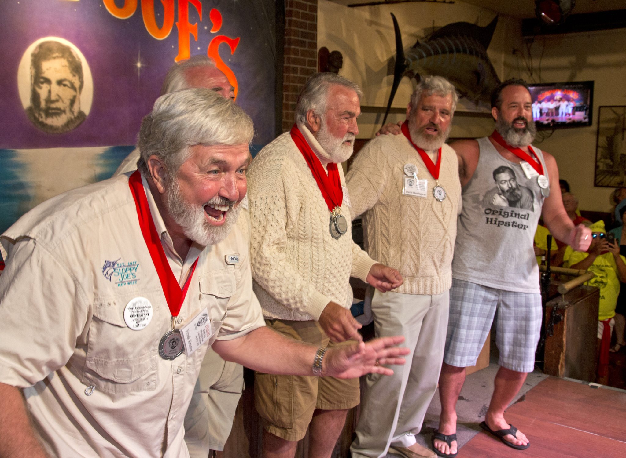 In this Saturday, July 23, 2016 photo provided by the Florida Keys News Bureau, Frank Kramer, left, implores the judges to choose him to be the winner of the 2016 Ernest "Papa" Hemingway Look-Alike Contest at Sloppy Joe's Bar in Key West, Fla. Kramer didn't win but was among five finalists of the contest that attracted 140 entrants and was the highlight of the subtropical island's Hemingway Days festival that ends Sunday. (Rob O'Neal/Florida Keys News Bureau via AP)