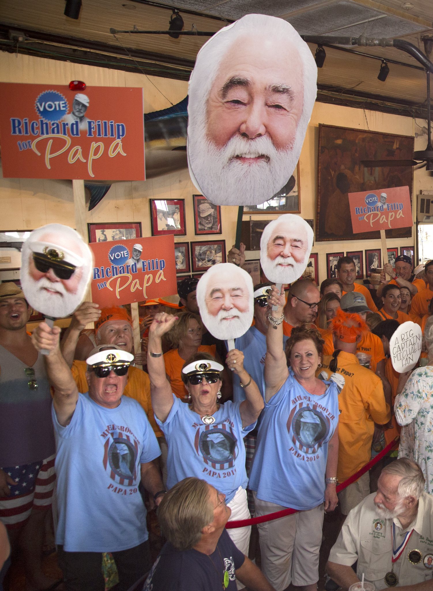 In this Saturday, July 23, 2016, photo provided by the Florida Keys News Bureau, supporters of Michael Groover and Richard Filip cheer for their favorites at the 2016 Ernest "Papa" Hemingway Look-Alike Contest at Sloppy Joe's Bar in Key West, Fla. The event, that attracted 140 entrants, was the highlight of the subtropical island's Hemingway Days festival that ends Sunday. (Rob O'Neal/Florida Keys News Bureau via AP)