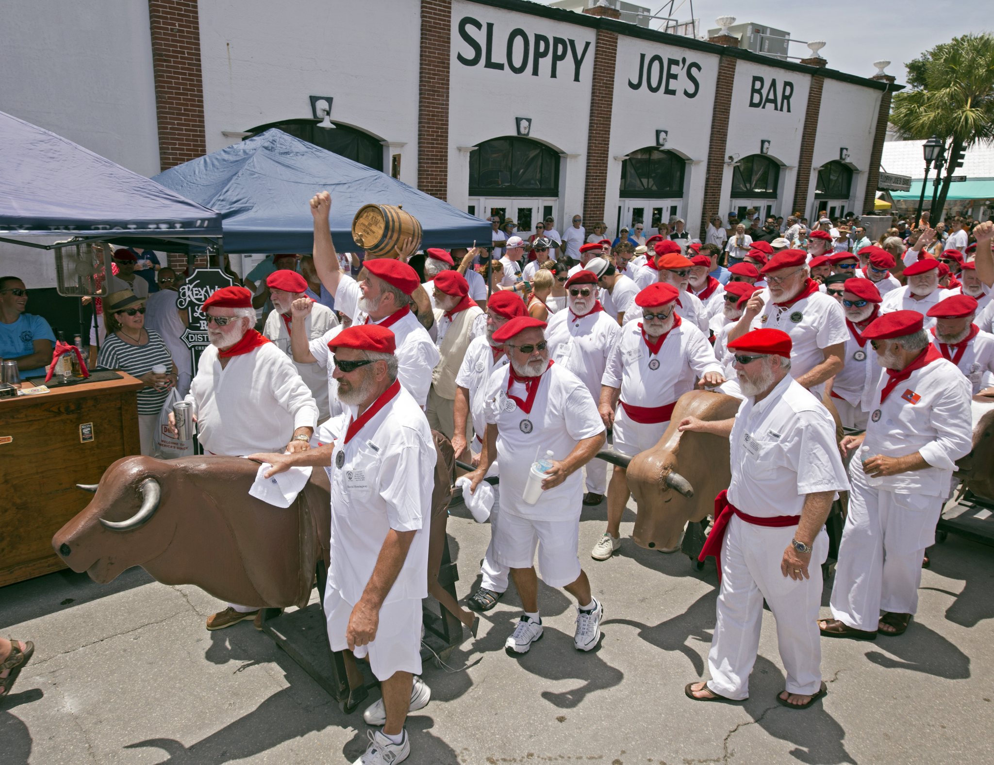 In this photo provided by the Florida Keys News Bureau, Ernest Hemingway look-alikes kick off the annual "Running of the Bulls" Saturday, July 23, 2016, in Key West, Fla. The whimsical and much safer answer to the event's namesake in Pamplona, Spain, was staged as a facet of the island city's annual Hemingway Days festival that ends Sunday, July 24. Hemingway lived and wrote in Key West throughout most of the 1930s. (Rob O’Neal/Florida Keys News Bureau via AP)
