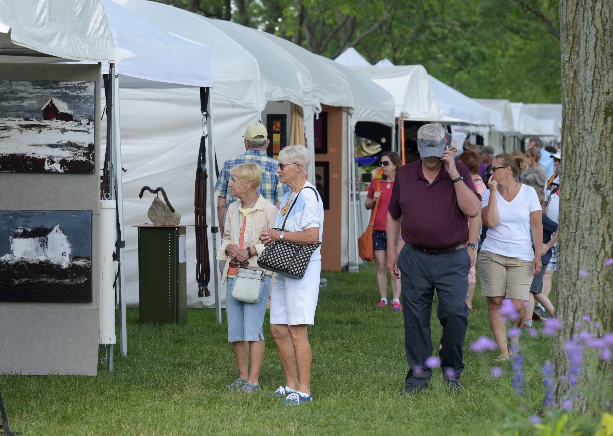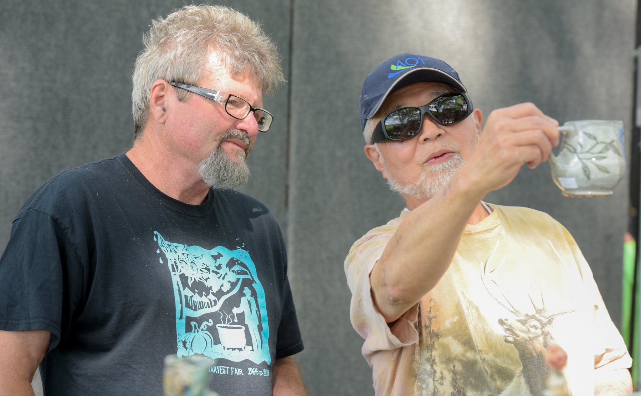 Johnie Dobson, left, of Rome, Georgia, talks with Lake Zurich artist Jeff Chiu about his pottery Sunday during Cantigny Park’s annual Art in Bloom art show. The juried show traditionally attracts thousands of visitors to check out the art exhibited in tents on the Parade Ground outside the Visitor Center. Cantigny spokesman Jeff Reiter said organizers know there are many summer art shows, “but Art in Bloom stands above because of the venue.” (Mark Black/mblack@dailyherald.com)