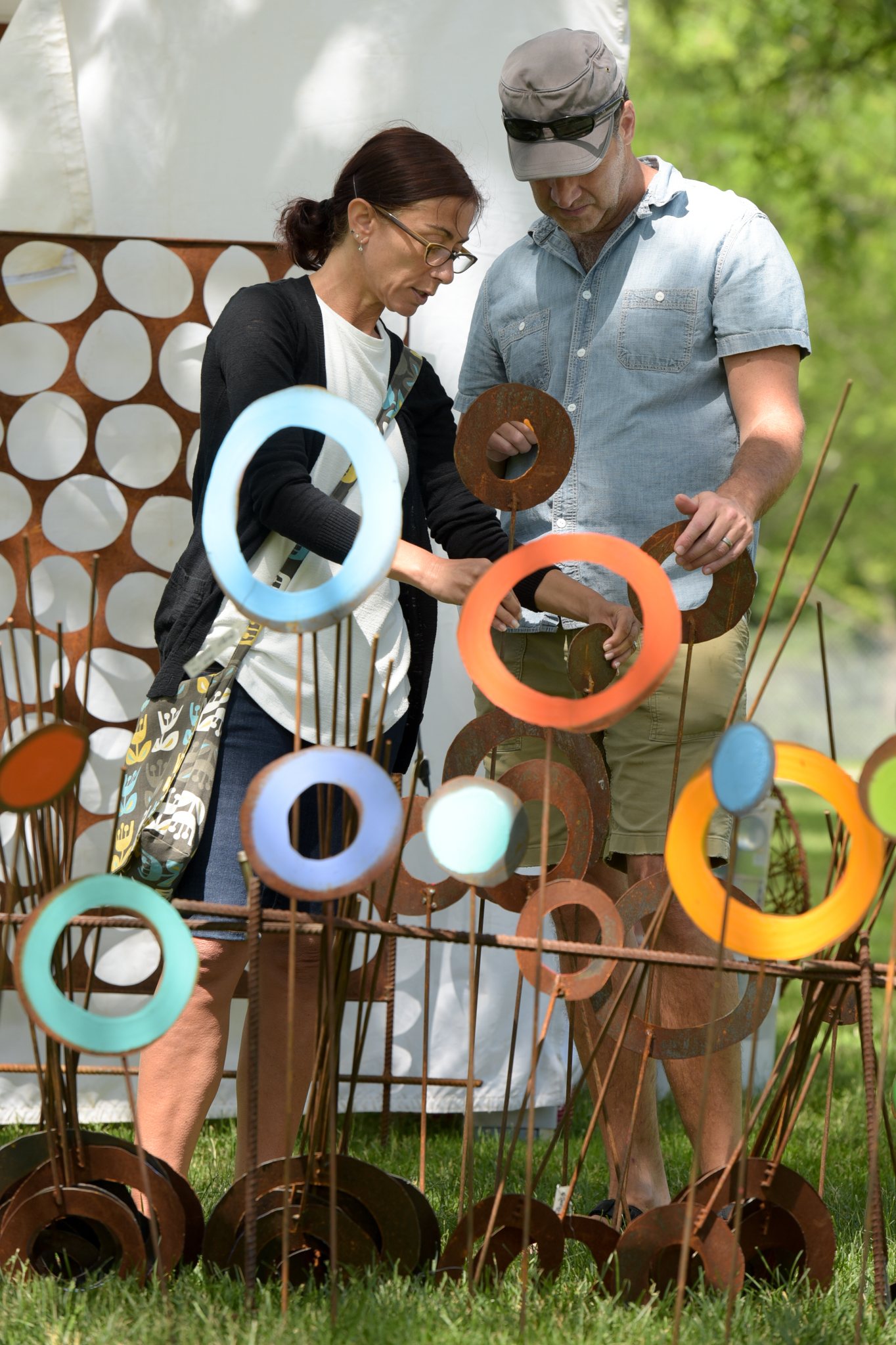 Lisa and Steve Saylors of Villa Park shop for some artwork from “Girly Steel” during Cantigny Park’s annual Art in Bloom art show on Sunday. (Mark Black/mblack@dailyherald.com)