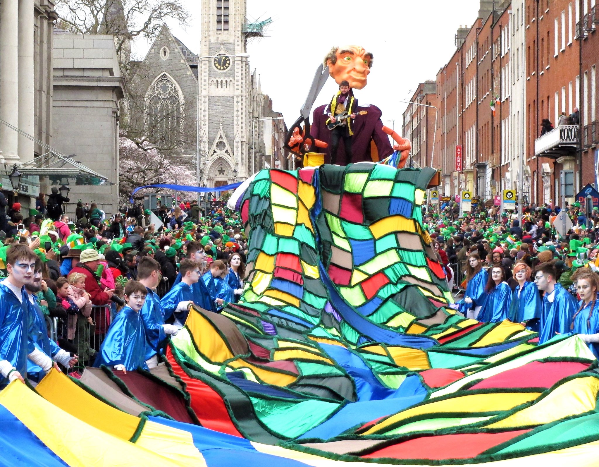 Throngs of tourists and Dubliners, many of them donning leprechaun costumes, braved gusty winds to pack the route for the parade as it traveled down O’Connell Street across the River Liffey and on to St. Patrick’s Cathedral. Dublin’s parade, by far the largest of dozens nationwide, forms the centerpiece of a four-day festival that marks the start of Ireland’s tourist season.