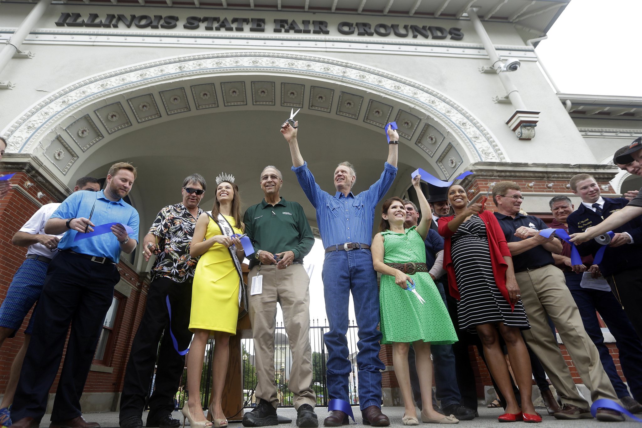 Illinois Gov. Bruce Rauner, center with arms raised, participates in opening ceremonies at the Illinois State Fair Friday, Aug. 12, 2016, in Springfield, Ill. The fair will run from Aug 12, throughout Aug. 21. (AP Photo/Seth Perlman)