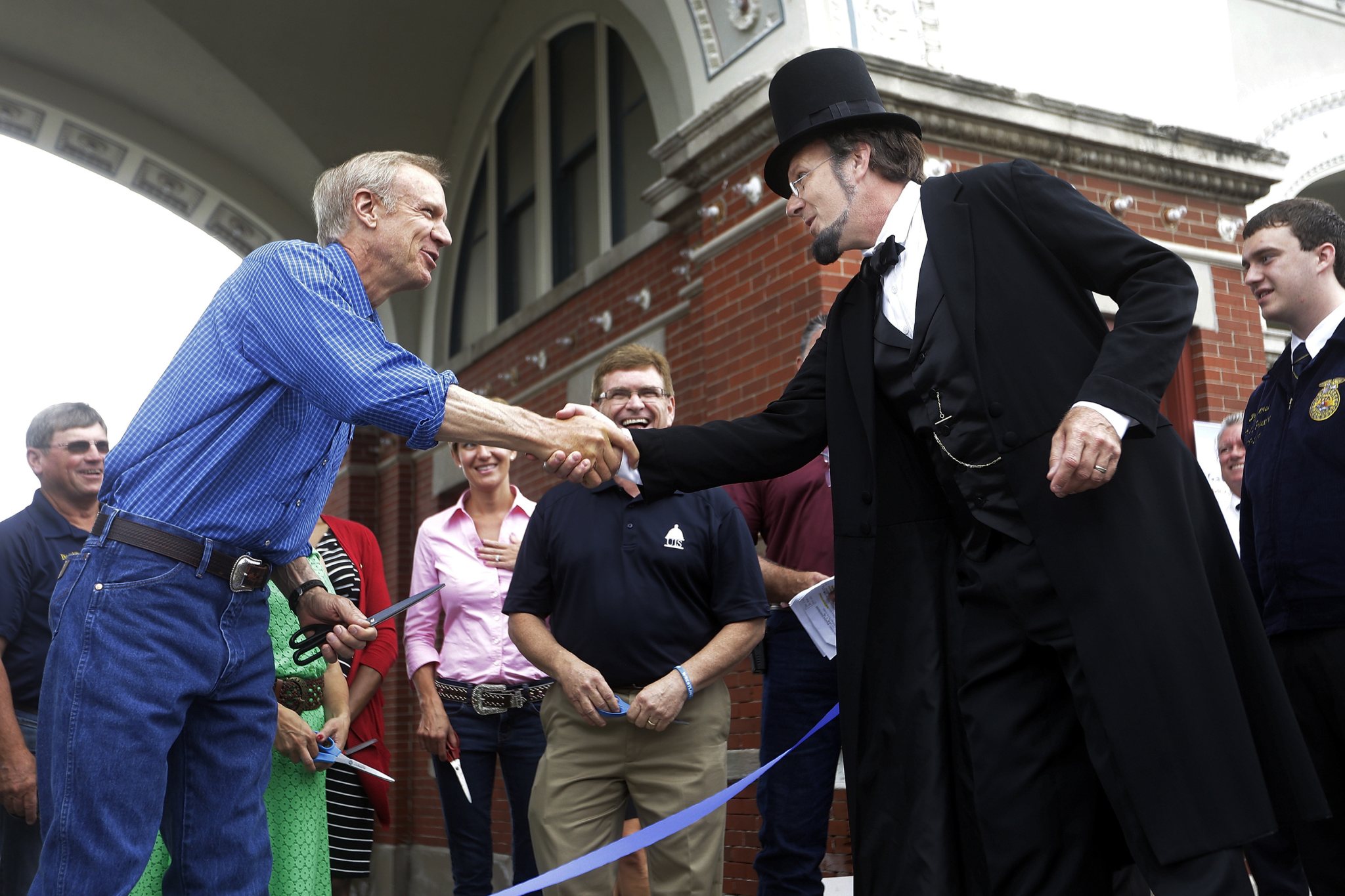 Gov. Bruce Rauner gets some help from another well-known Illinois resident to open the Illinois State Fair Friday in Springfield. The fair runs through Aug. 21. For details and an event schedule, visit illinois.gov/statefair. (Associated Press photos)