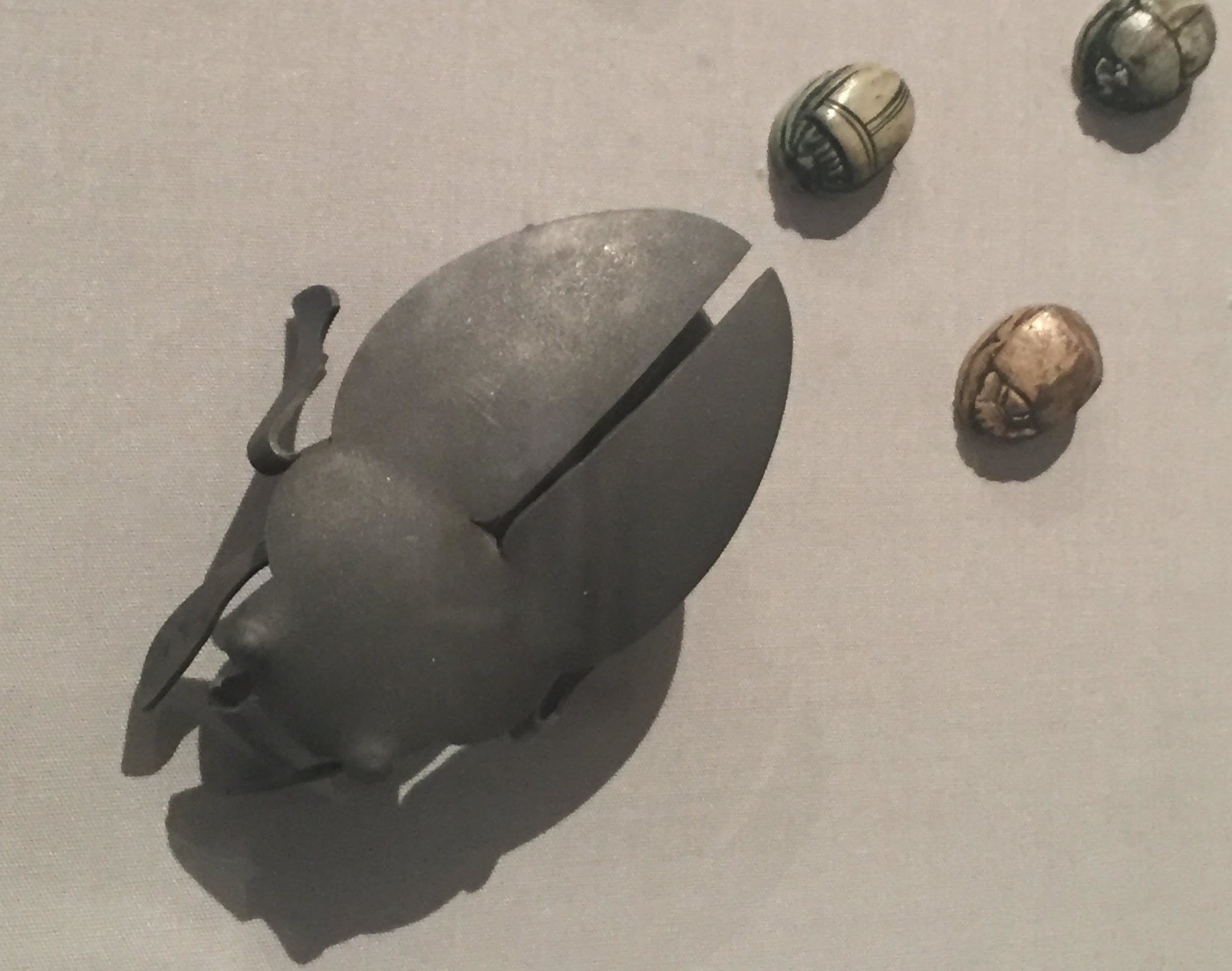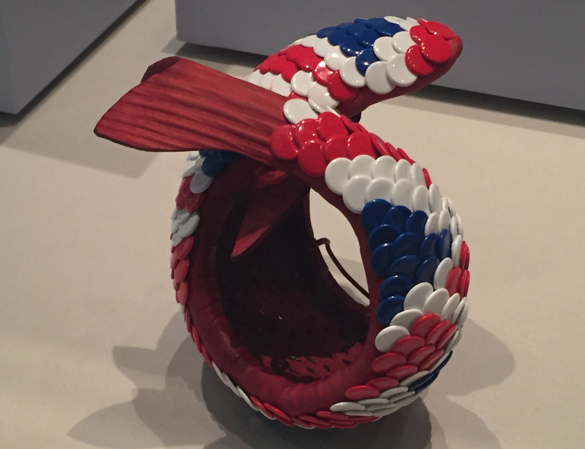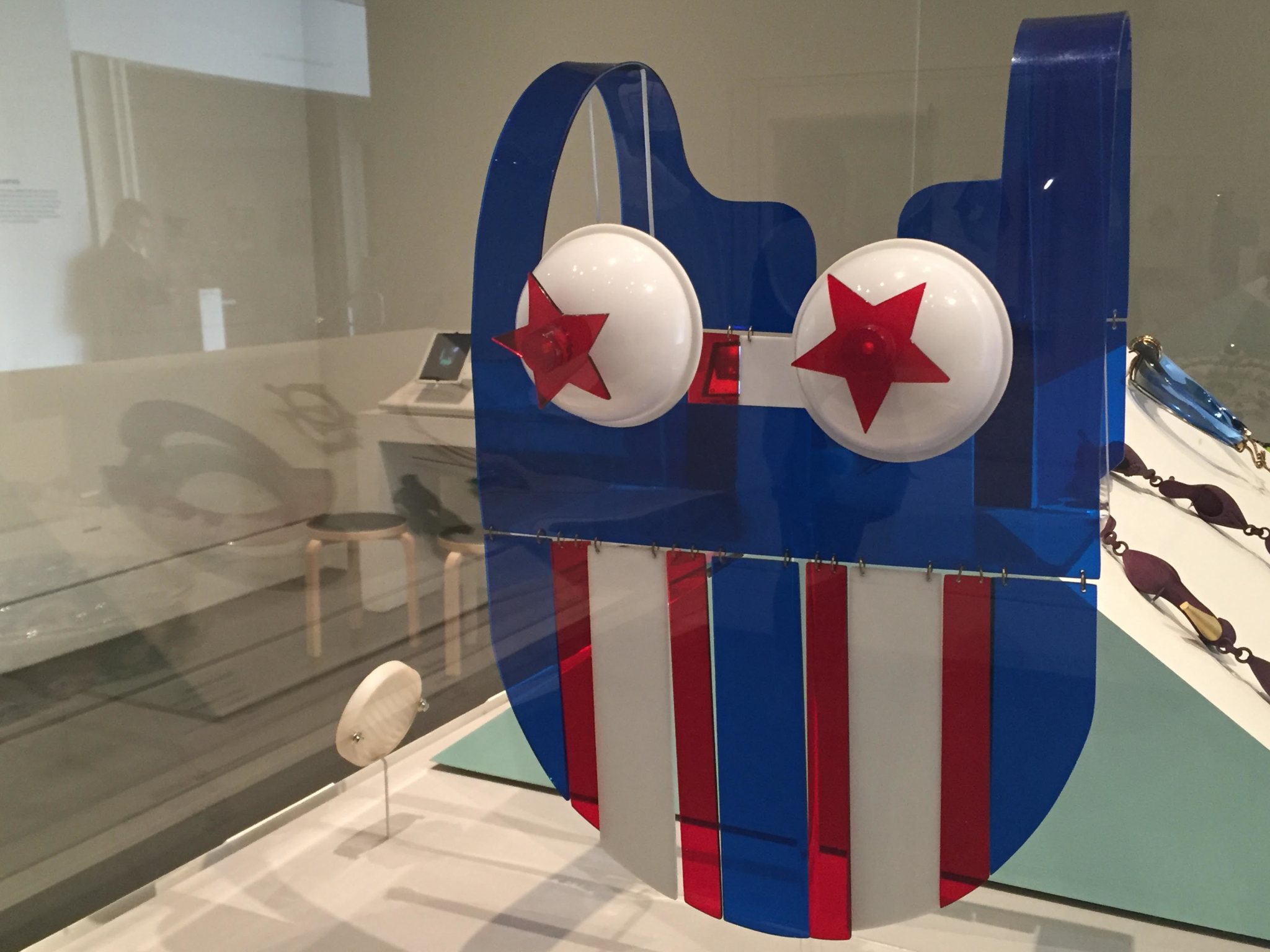A 1969 red-white-and-blue Plexiglas breastplate by the late East Coast jeweler Carolyn Kriegman has saucy, bright-red stars covering the chest. Swiss jeweler David Bielander’s 2007 “Dung Beetle” brooch — which Bielander created by bending and slicing a spoon — and his 2013 thumb tack-decorated “Koi” bracelet imaginatively use everyday materials.