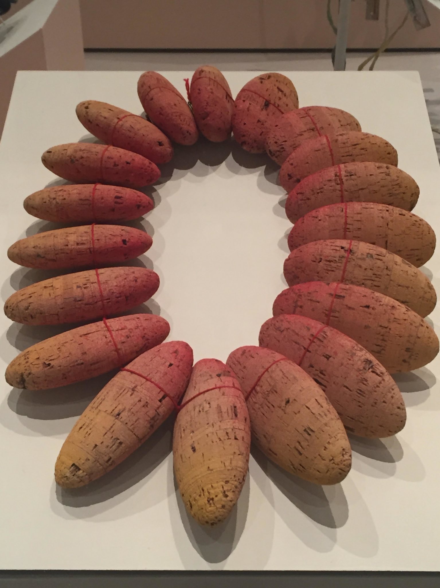 Dutch artist and jeweler Paul Derrez’s 1985 “Pebble Collar” is made out of potato-size ovals of cork, lightly spray-painted pink and strung with a red cotton cord.