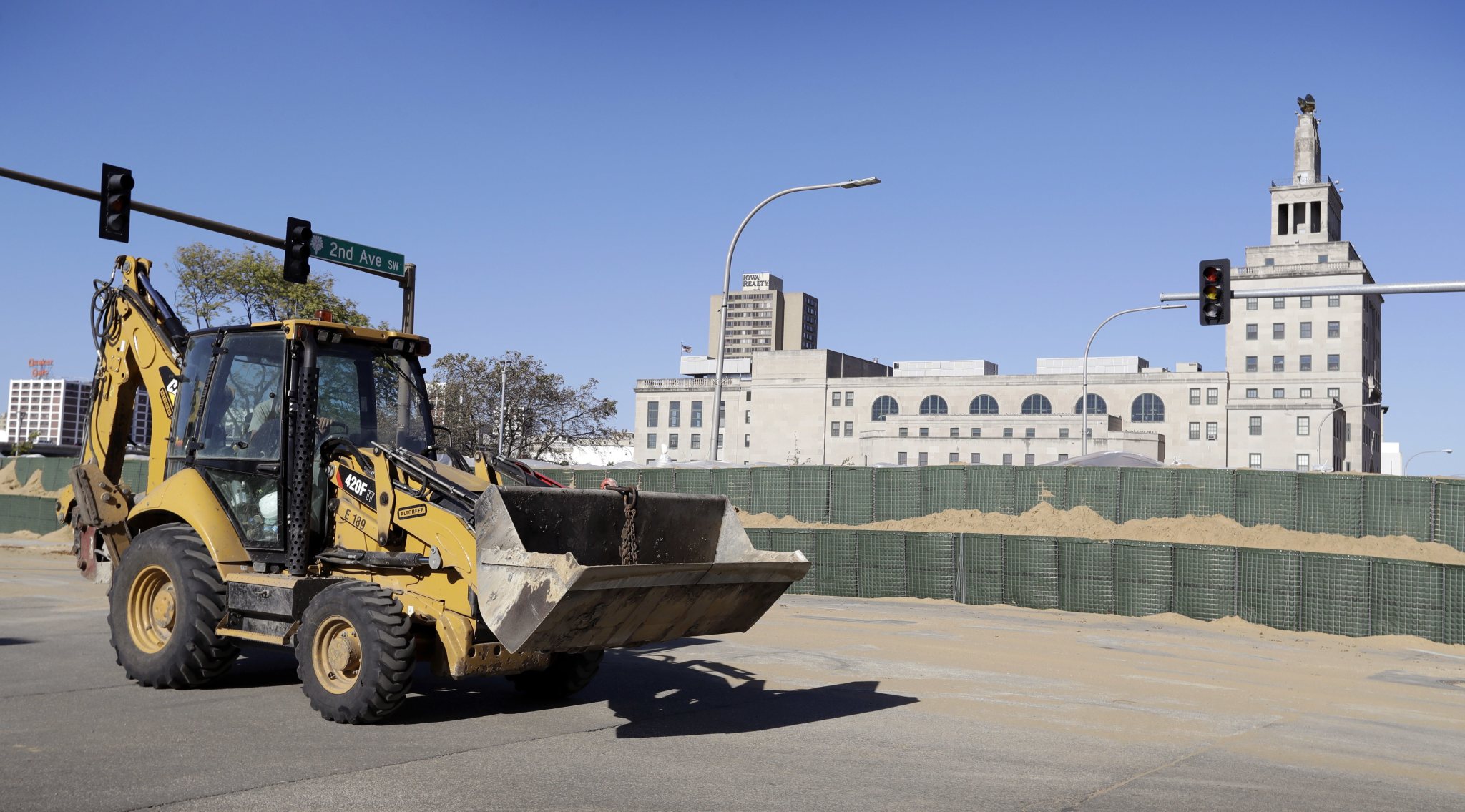 A worker drives a front end loader past a flood wall made of Hesco barriers on the bank of the Cedar River, Monday, Sept. 26, 2016, in Cedar Rapids, Iowa. Residents of Cedar Rapids are waiting anxiously as the quickly rising river threatens to inundate their city with devastating floodwaters. (AP Photo/Charlie Neibergall)