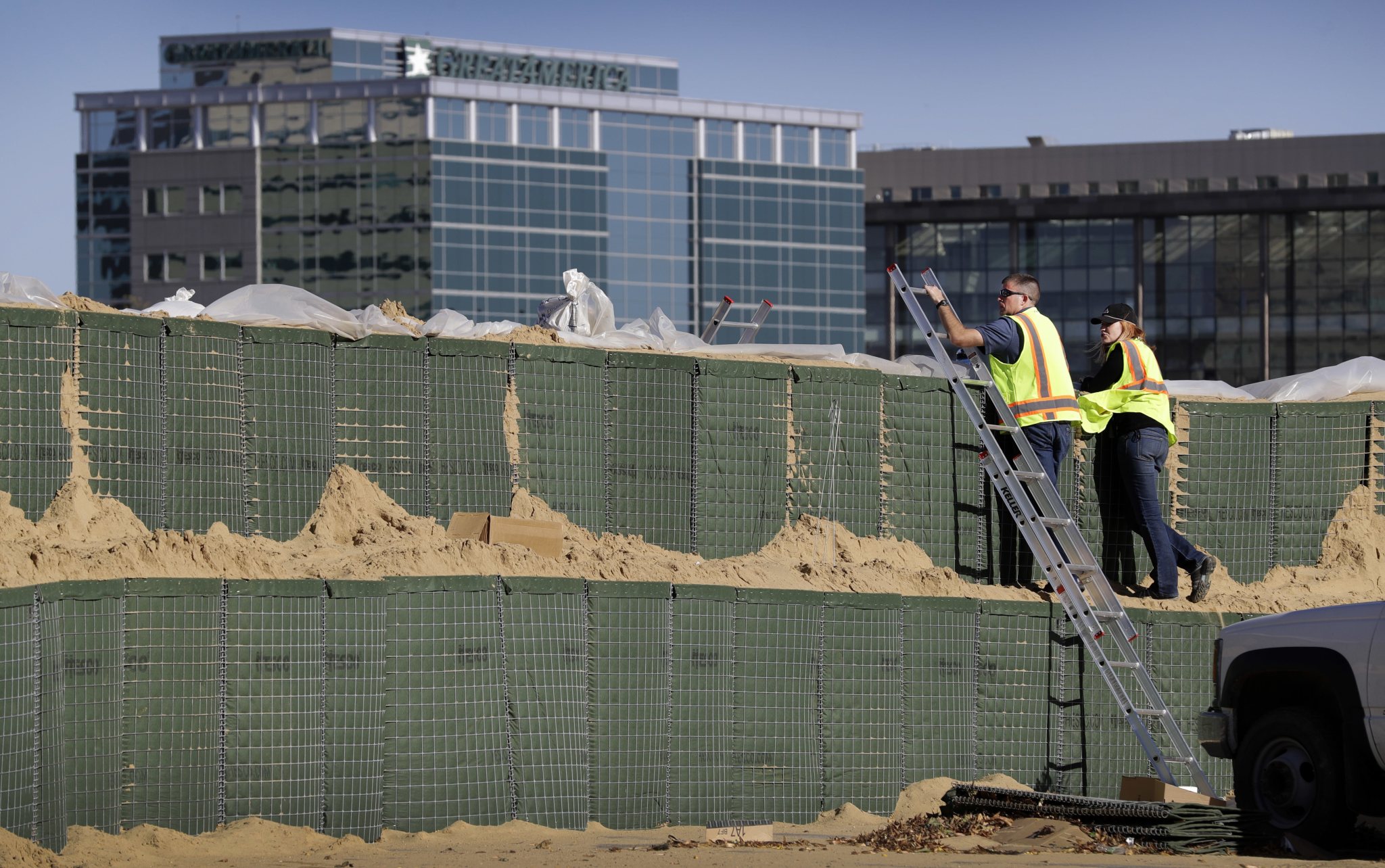 Workers stand on a flood wall made of Hesco barriers on the bank of the Cedar River, Monday, Sept. 26, 2016, in Cedar Rapids, Iowa. Residents of Cedar Rapids are waiting anxiously as the quickly rising river threatens to inundate their city with devastating floodwaters. (AP Photo/Charlie Neibergall)