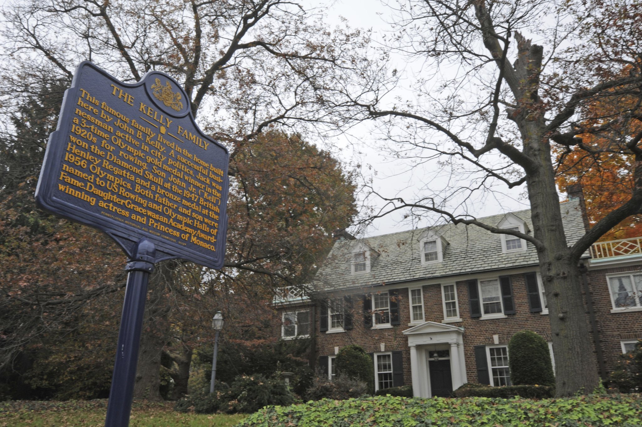 The home was built in 1935 by Kelly’s father, John B. Kelly. He was a three-time Olympic gold medal-winning rower in the 1920s and later a prominent businessman active in Philadelphia politics. A sign posted outside designates the structure as a Pennsylvania historical landmark.