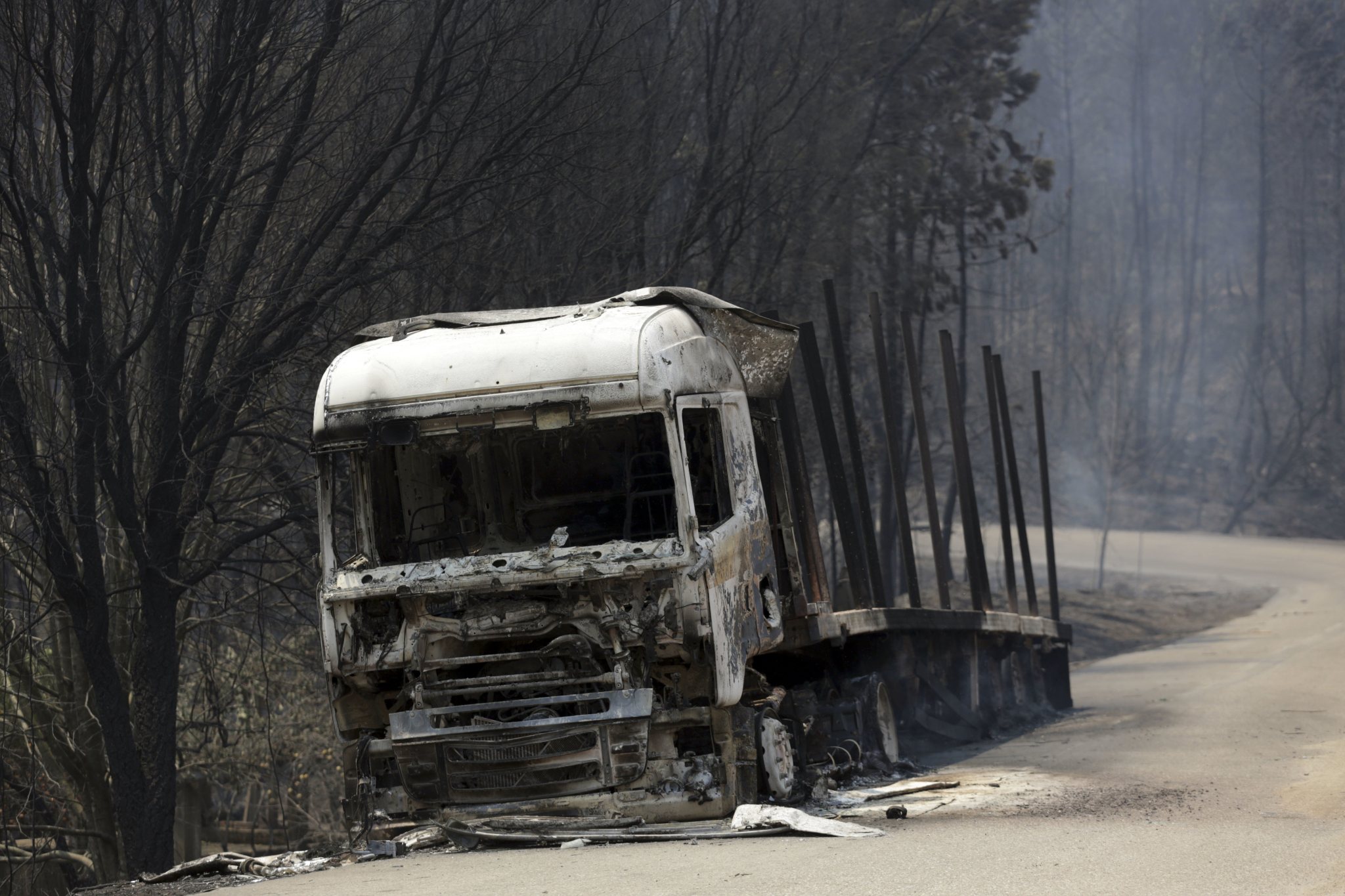 A burnt truck lies on a dirt road close to the road between Castanheira de Pera and Figueiro dos Vinhos, central Portugal, Sunday, June 18 2017. Raging forest fires in central Portugal killed at least 50 people, many of them trapped in their cars as flames swept over a road Saturday evening. (AP Photo/Armando Franca),