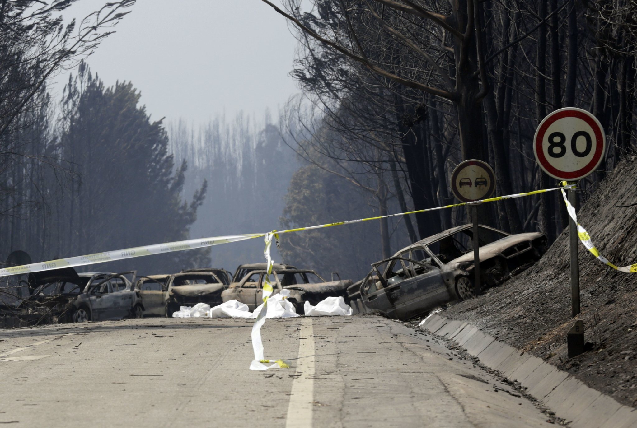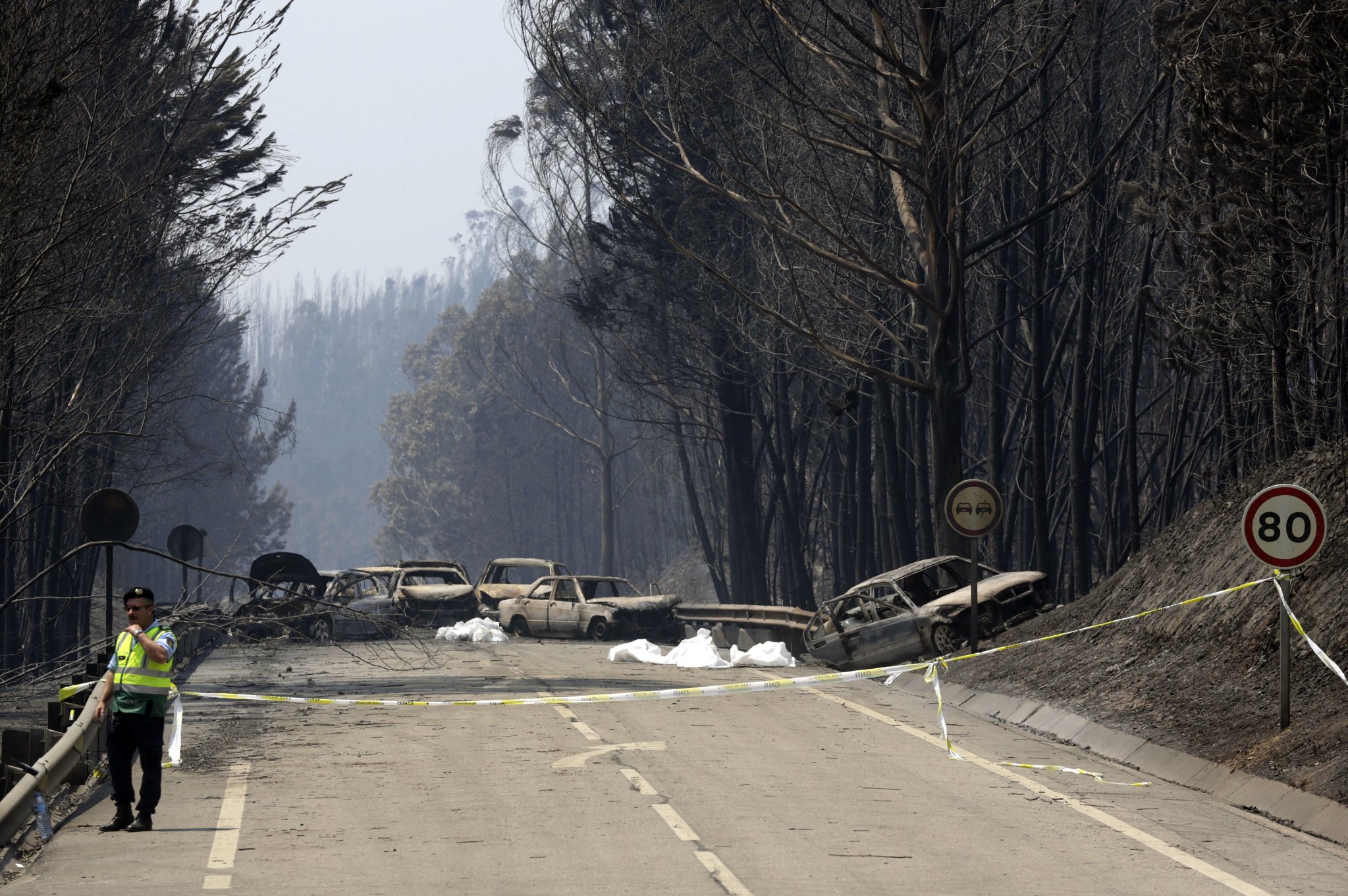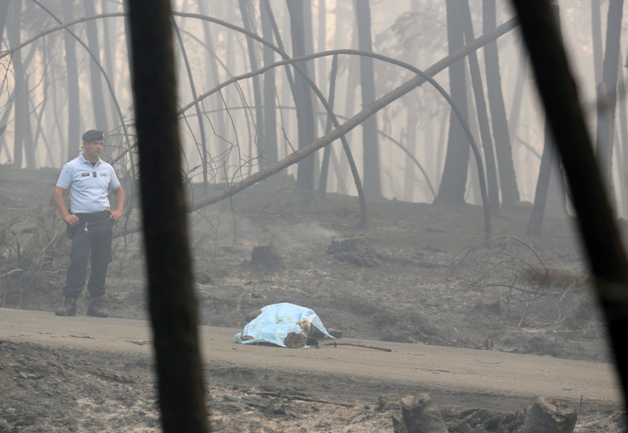 A policeman stands by a covered body on a dirt road outside Pedrogao Grande, central Portugal, Sunday, June 18 2017. Raging forest fires in central Portugal killed more than 50 people, many of them trapped in their cars as flames swept over a road, in what the prime minister on Sunday called “the biggest tragedy of human life that we have known in years”. (AP Photo/Armando Franca),