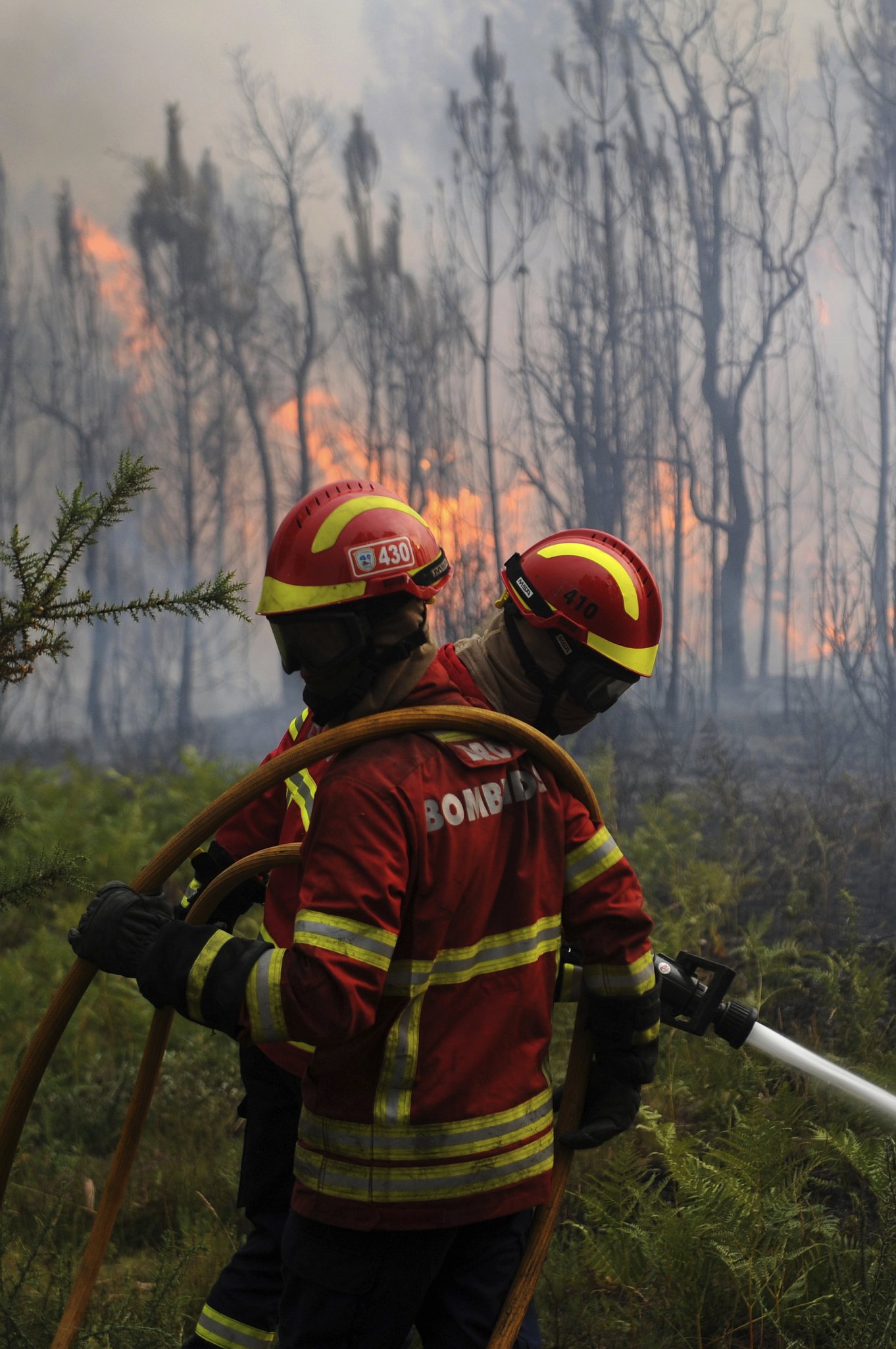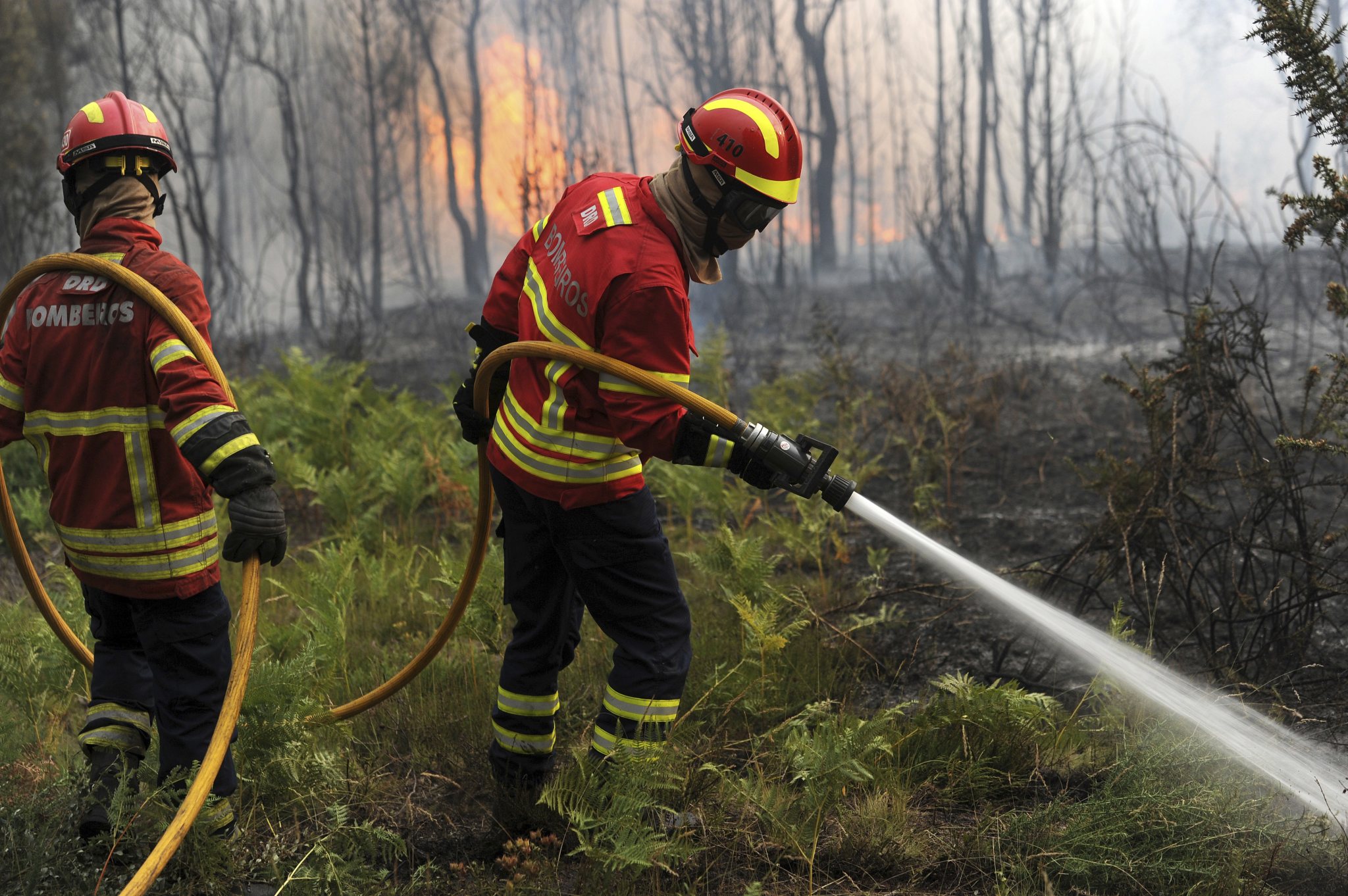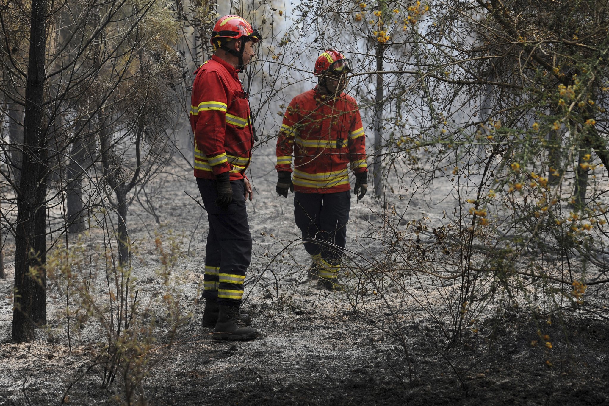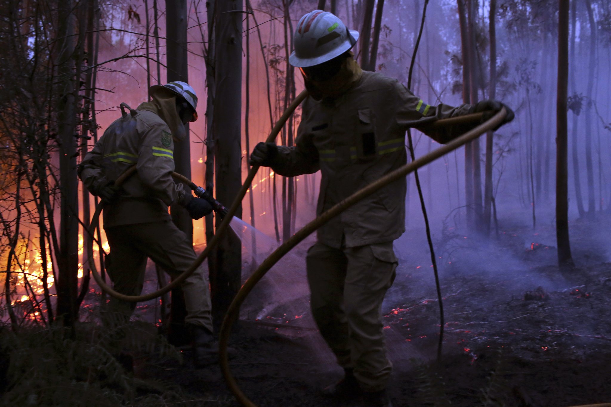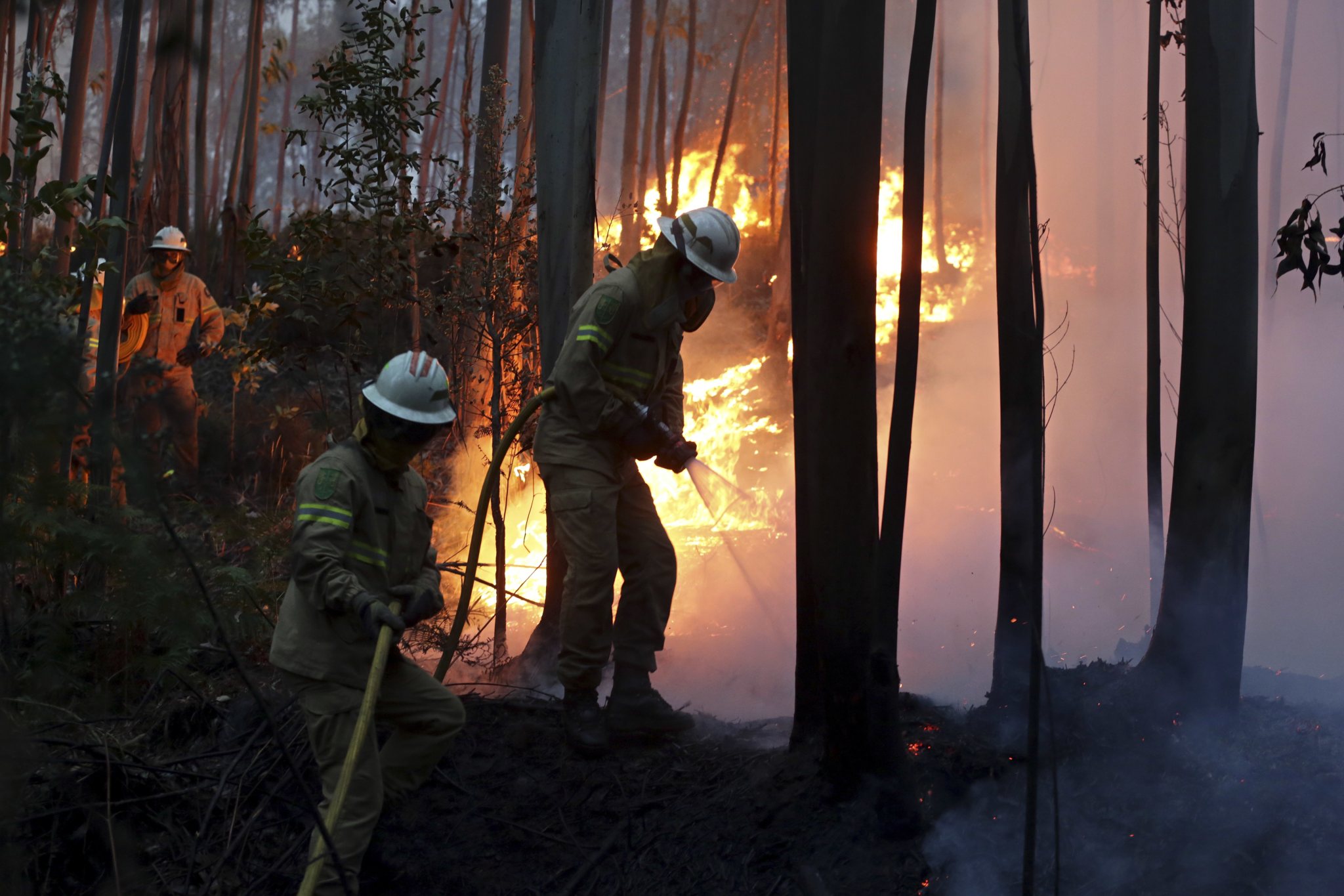 Portuguese firefighters make checks as they work to stop a forest fire from reaching the village of Figueiro dos Vinhos central Portugal, Sunday, June 18, 2017. Portugal’s president says the country’s pain “knows no end” as it mourns at least 61 people killed in the deadliest wildfire in memory. (AP Photo/Paulo Duarte)