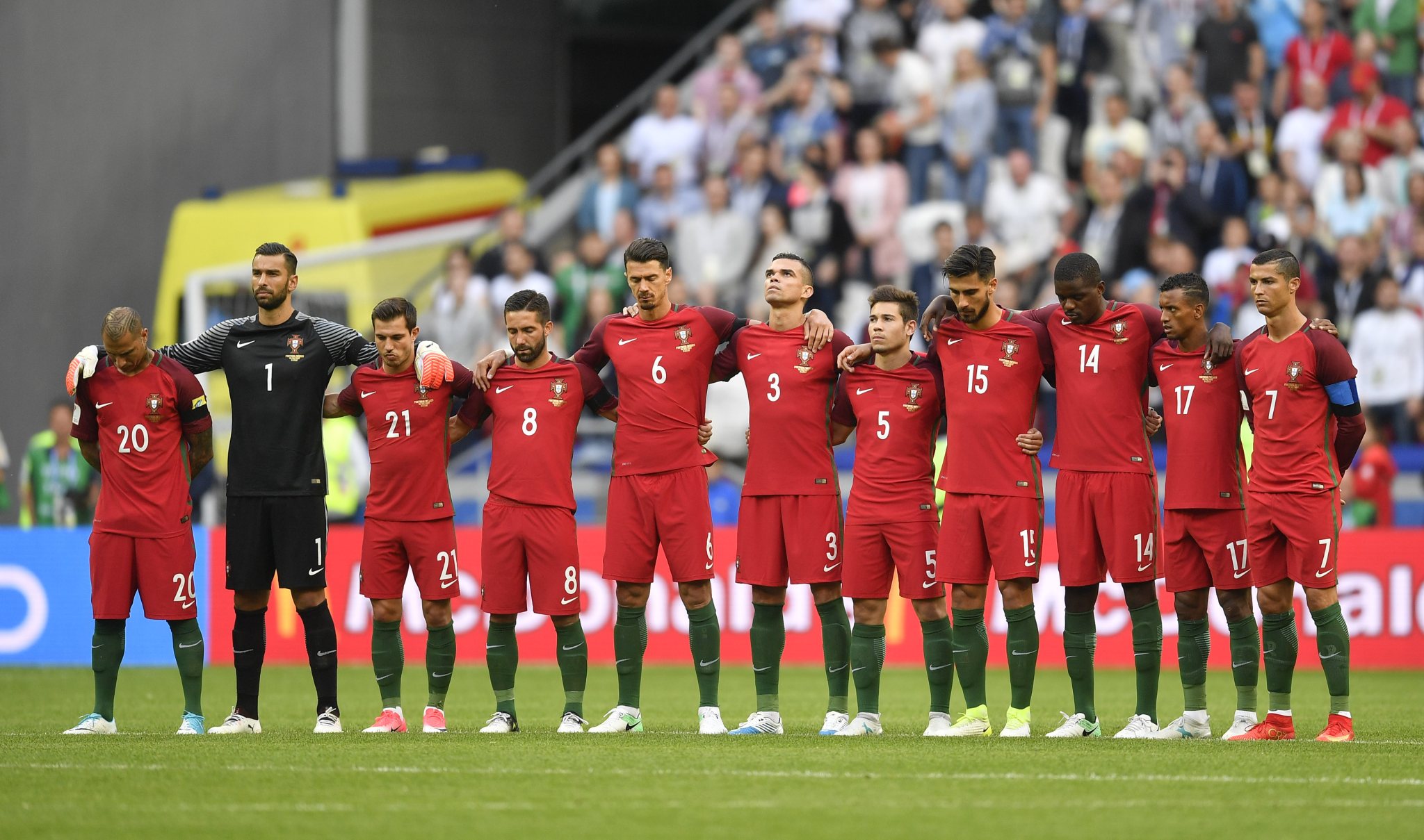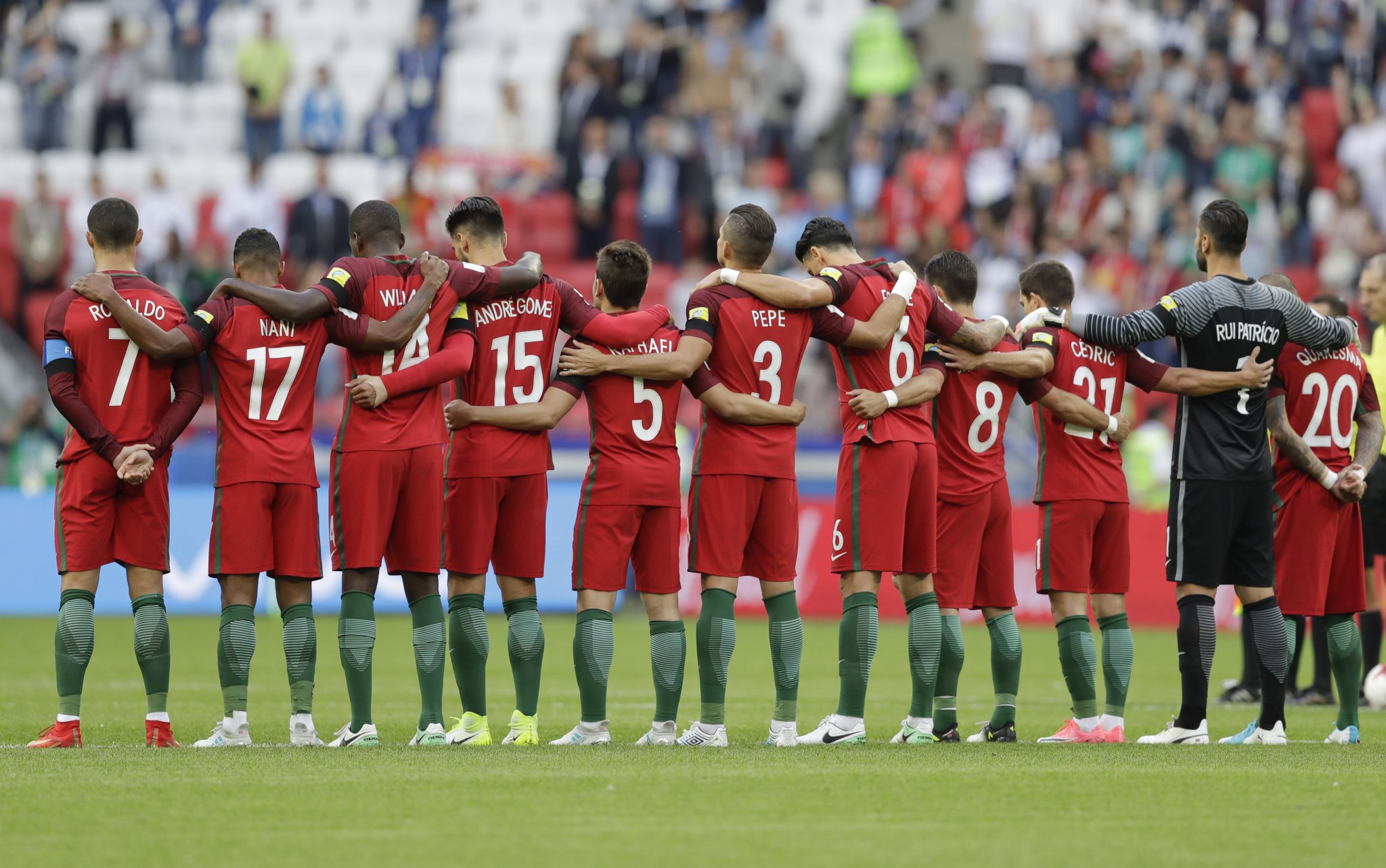 Players observe a minute of silence to honor the victims of forest fires that raged through central Portugal, prior to the Confederations Cup, Group A soccer match between Portugal and Mexico, at the Kazan Arena, Russia, Sunday, June 18, 2017. (AP Photo/Martin Meissner)