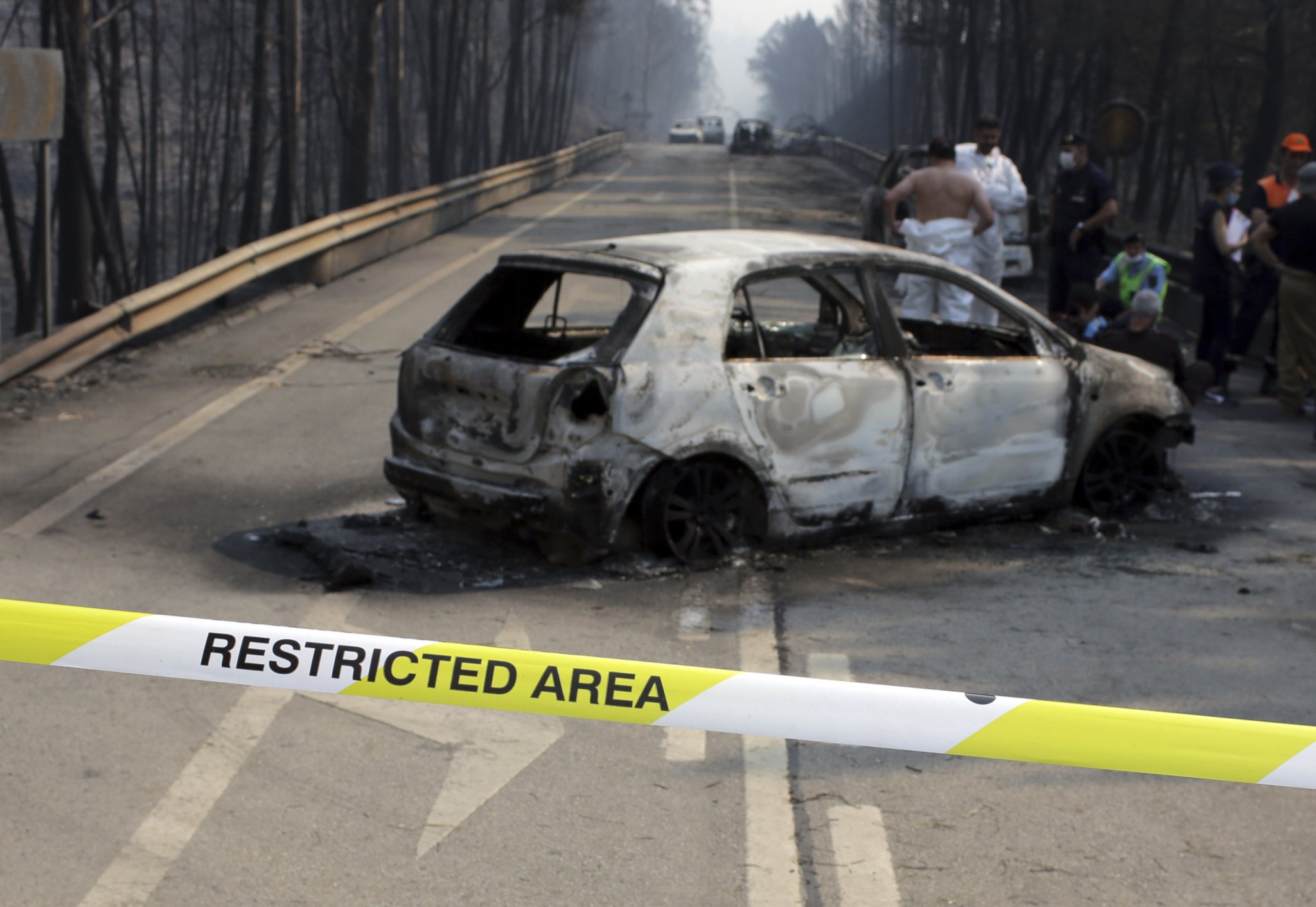 Police investigators stand by a burnt car on the road between Castanheira de Pera and Figueiro dos Vinhos, central Portugal, Sunday, June 18 2017. Raging forest fires in central Portugal killed more than 50 people, many of them trapped in their cars as flames swept over a road, in what the prime minister on Sunday called “the biggest tragedy of human life that we have known in years.” (AP Photo/Armando Franca),