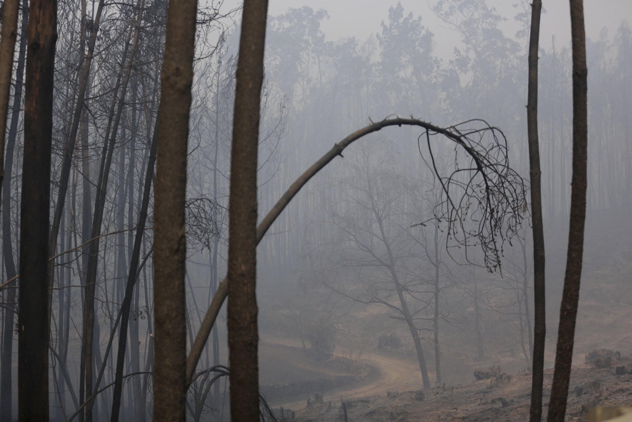 Burnt trees stand by the side of a road approaching Pedrogao Grande, central Portugal, Sunday, June 18 2017. Raging forest fires in central Portugal killed at least 50 people, many of them trapped in their cars as flames swept over a road Saturday evening. (AP Photo/Armando Franca),