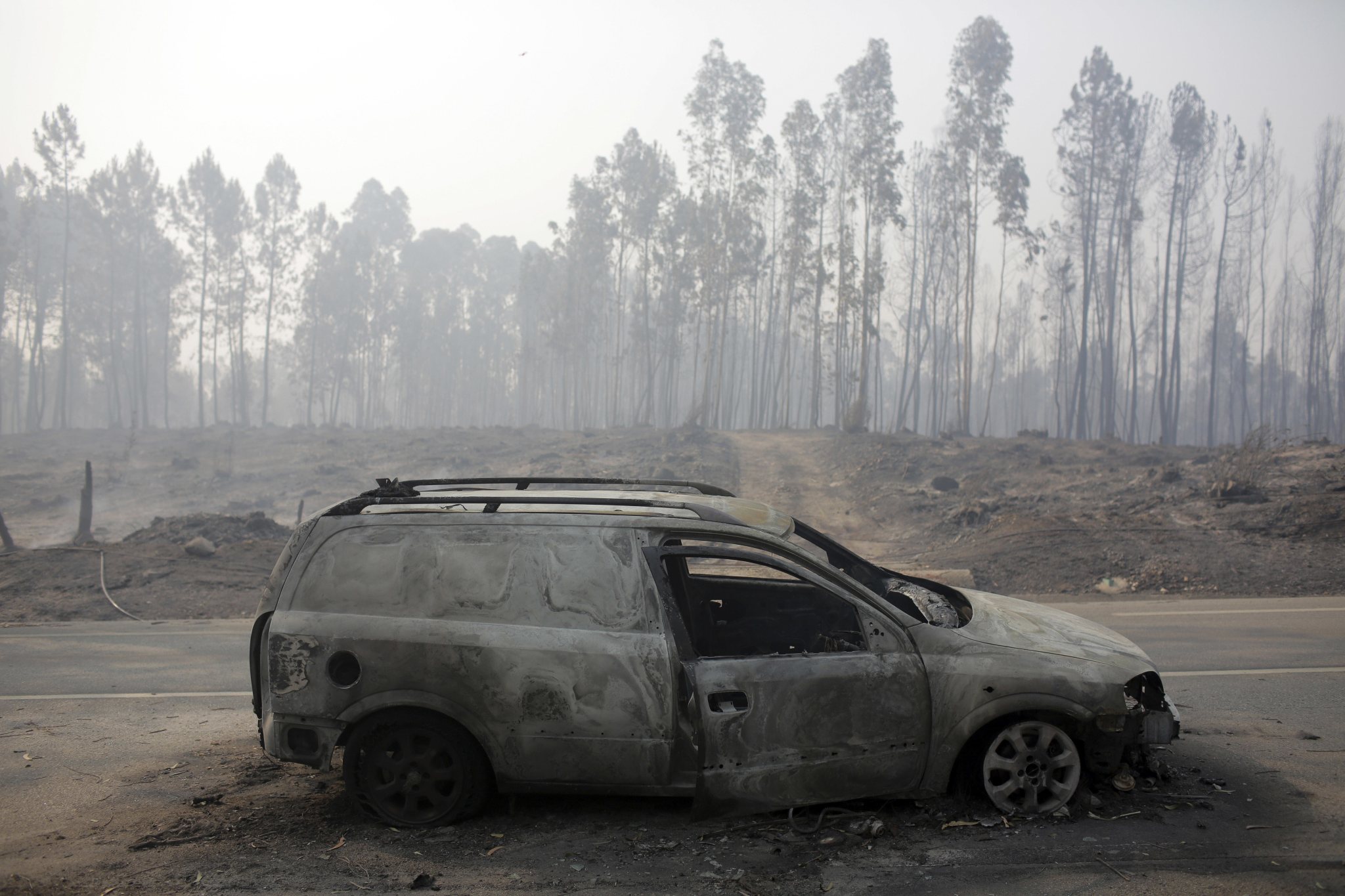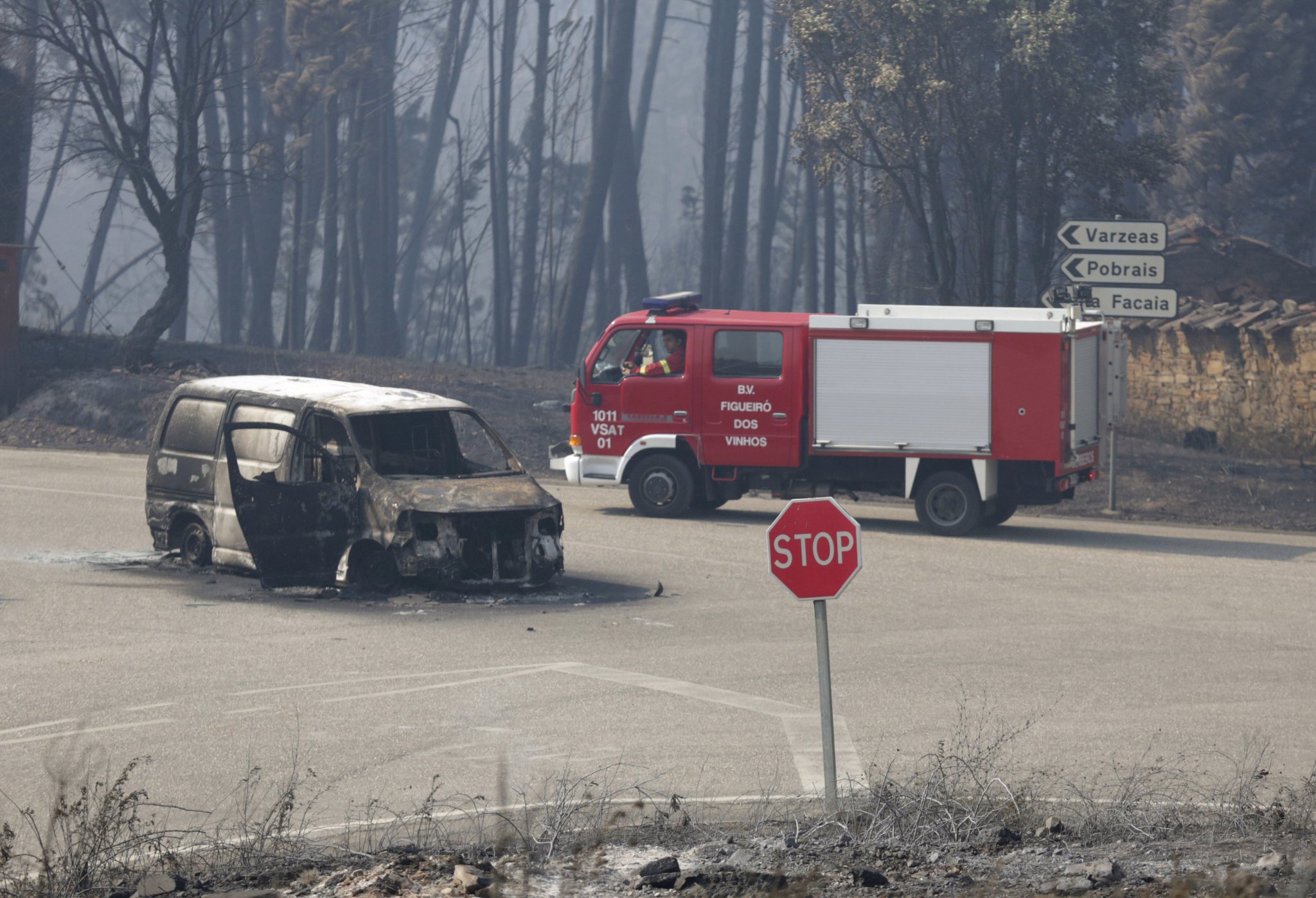 A fire engine drives past a burnt van by an exit of the road between Castanheira de Pera and Figueiro dos Vinhos, central Portugal, Sunday, June 18 2017. Raging forest fires in central Portugal killed at least 50 people, many of them trapped in their cars as flames swept over a road Saturday evening. (AP Photo/Armando Franca),