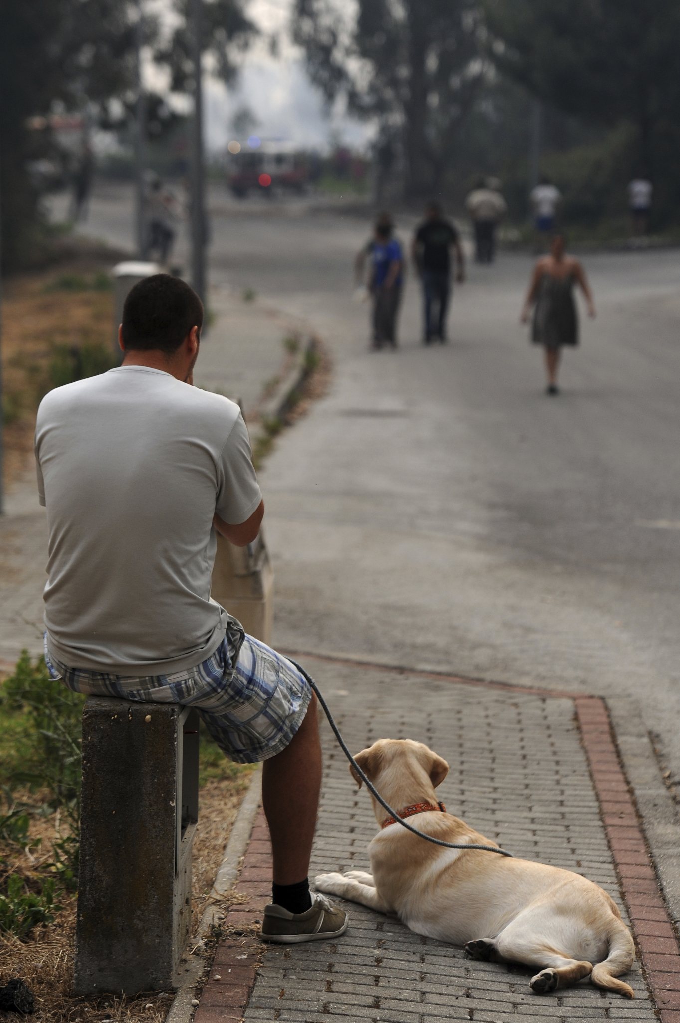 A local person with a dog watch Portuguese firefighters work to stop a forest fire from reaching the village of Figueiro dos Vinhos central Portugal, Sunday, June 18, 2017. Portugal’s president says the country’s pain “knows no end” as it mourns at least 61 people killed in the deadliest wildfire in memory. (AP Photo/Paulo Duarte)