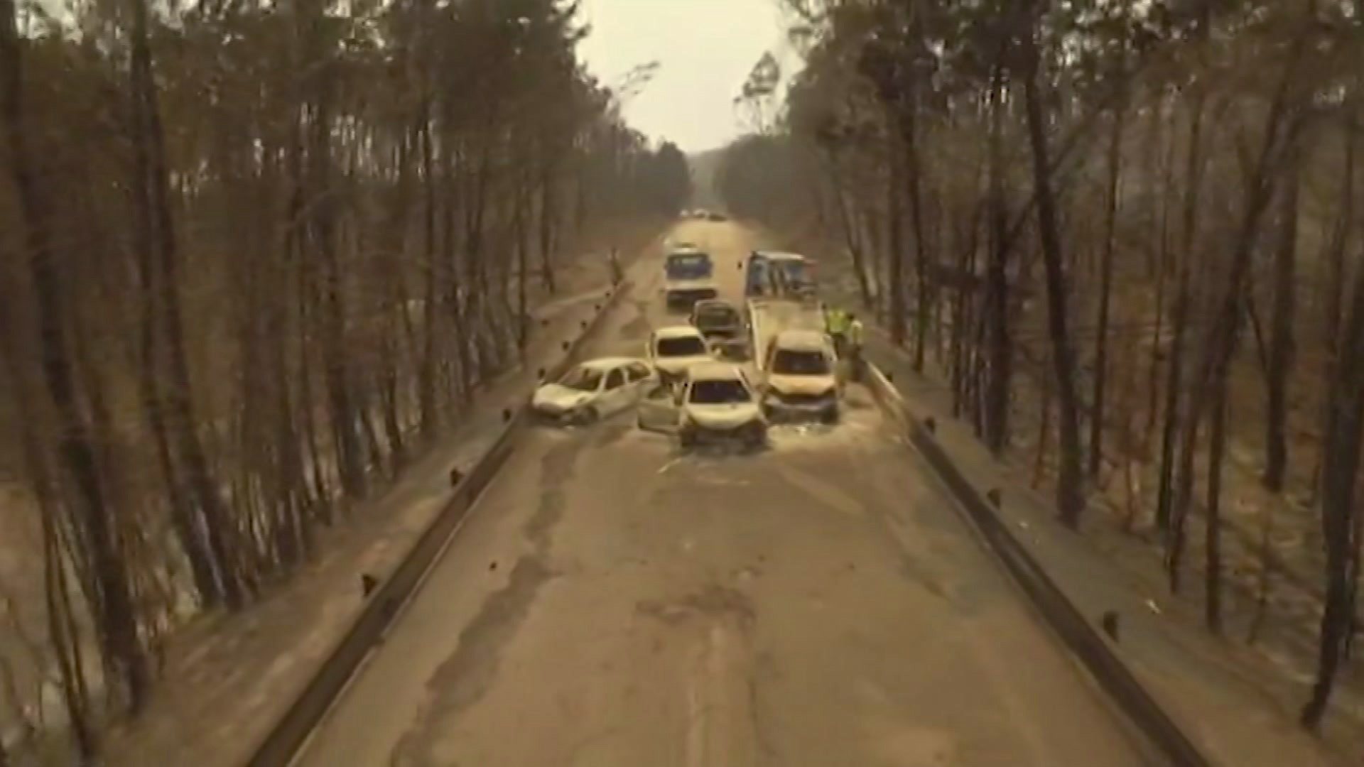 In this grab taken from Drone video a view of cars on the road IC8 between Pedrogao Grande and Figeiro Dos Vinhos after a forest fire, in Portugal, Sunday, June 18, 2017. A raging forest fire in central Portugal sent flames sweeping over roads, killing at least 61 people, many of them trapped in their cars as they tried to flee, officials said Sunday. (SIC via AP)