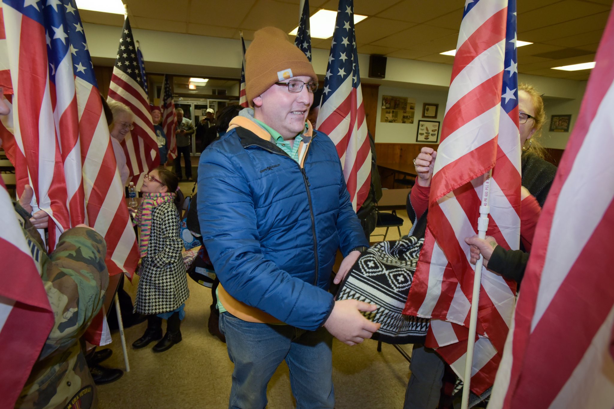 When they arrived, about 40 family members, friends, city officials, firefighters, police officers and veterans were gathered to greet Vargas with a warm welcome and thank him for his service. They formed two lines with more than a dozen American flags and yelled, “Welcome home!” as a stunned Vargas walked through the doors.