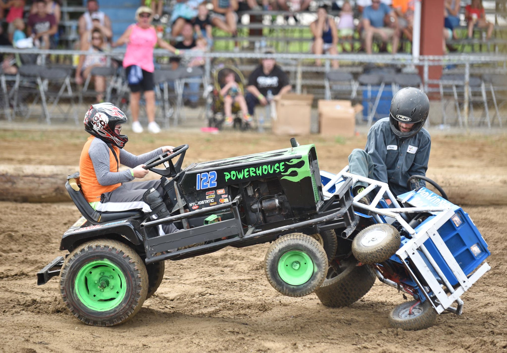 At left, Dayden Charette, 10, hits Jacob Van Winkle and pushes him on to his side during the lawn mower demolition derby Sunday at the Kane County Fair in St. Charles. Charette, of St. Charles, won the event for the second year in a row, driving against competitors more than twice his age.
