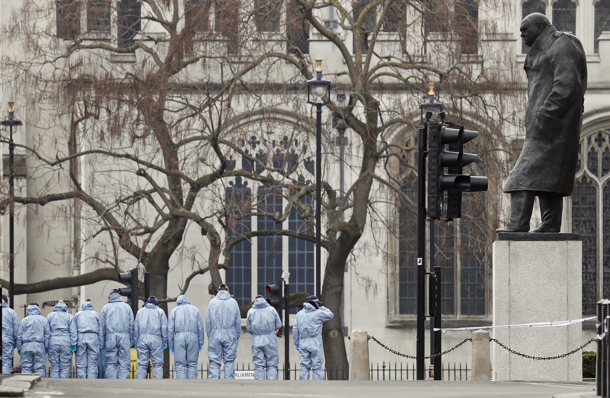 Police forensic officers work in Parliament Square overseen by the statue of Winston Churchill outside the Houses of Parliament in London, Thursday March 23, 2017. On Wednesday a knife-wielding man went on a deadly rampage, first driving a car into pedestrians then stabbing a police officer to death before being fatally shot by police within Parliament’s grounds in London. (AP Photo/Kirsty Wigglesworth)