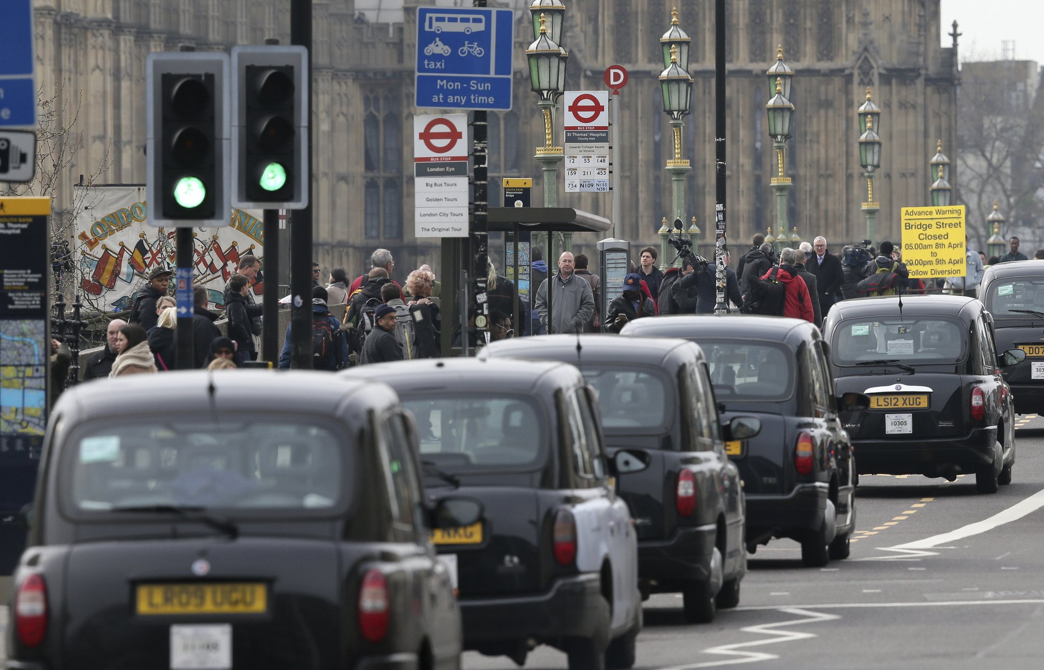 Black cabs cross Westminster Bridge after it was reopened to the public Thursday, March 23, 2017, following an attack on Wednesday when a man drove a car into pedestrians then stabbed a police officer to death before being fatally shot by police within Parliament’s grounds. The IS-linked Aamaq news agency said Thursday that the person who carried out the “attack in front of the British parliament in London was a soldier of the Islamic State.” (AP Photo/Tim Ireland)