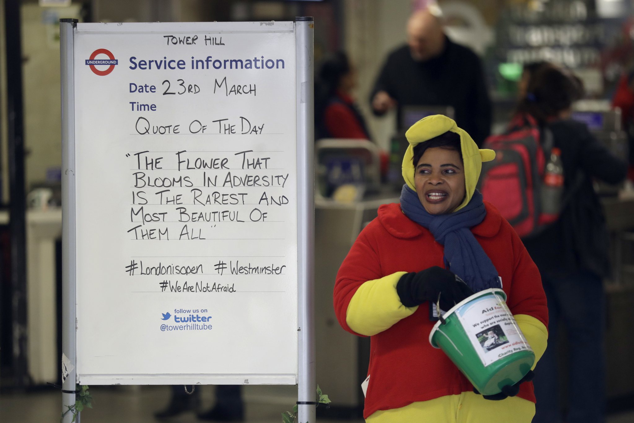 A woman collecting money for charity stands next to a quote written on an information board at Tower Hill underground train station, written in defiance of the previous day’s attack in London, Thursday, March 23, 2017. On Wednesday a man went on a deadly rampage, first driving a car into pedestrians then stabbing a police officer to death before being fatally shot by police within Parliament’s grounds in London. (AP Photo/Matt Dunham)
