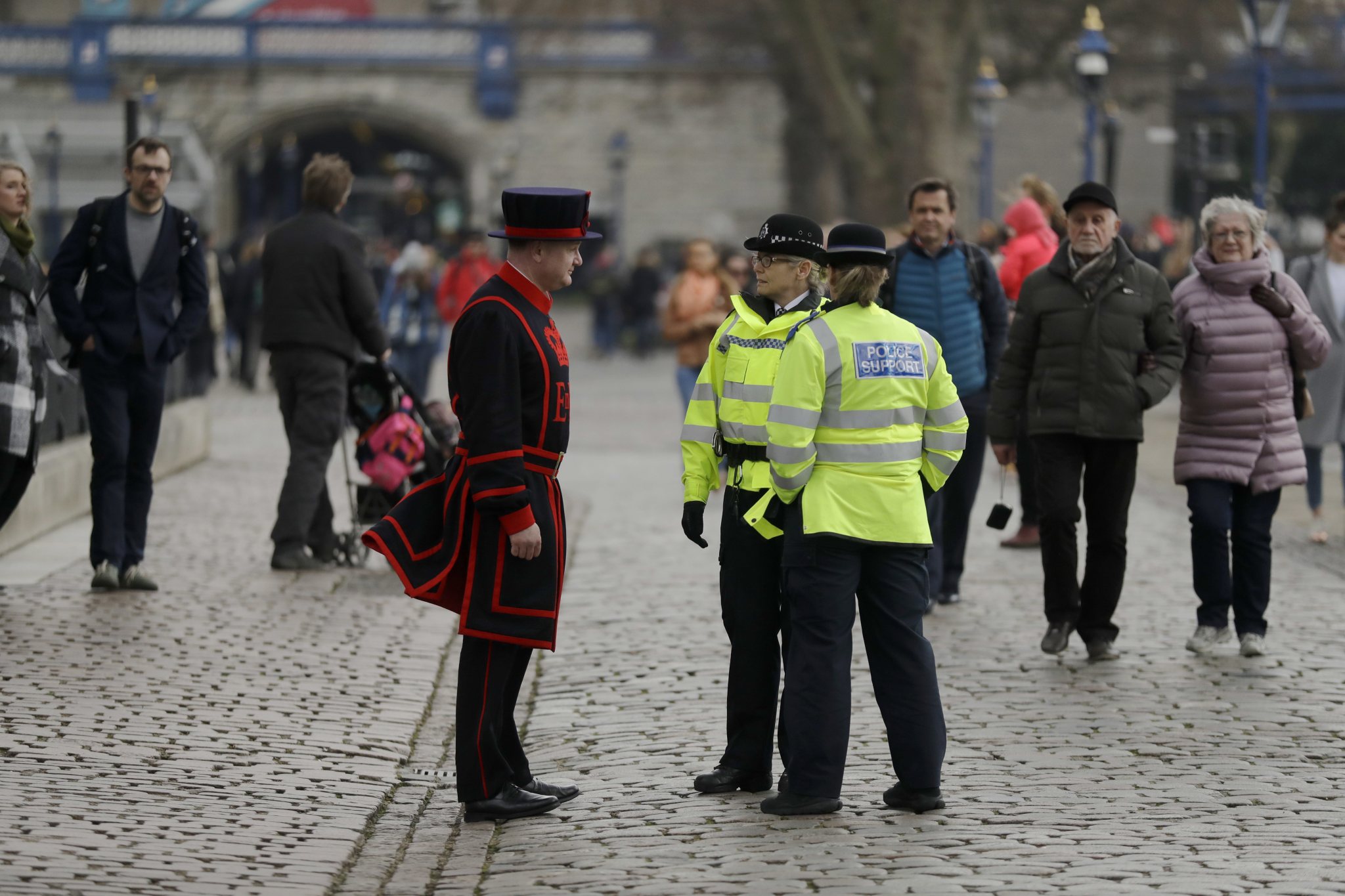 A police officer and support officer on patrol speak to a Yeoman Warder of the Tower of London, known as a Beefeater, at the Tower of London, a popular tourist attraction in London, Thursday, March 23, 2017. On Wednesday a man went on a deadly rampage, first driving a car into pedestrians then stabbing a police officer to death before being fatally shot by police within Parliament’s grounds in London. (AP Photo/Matt Dunham)