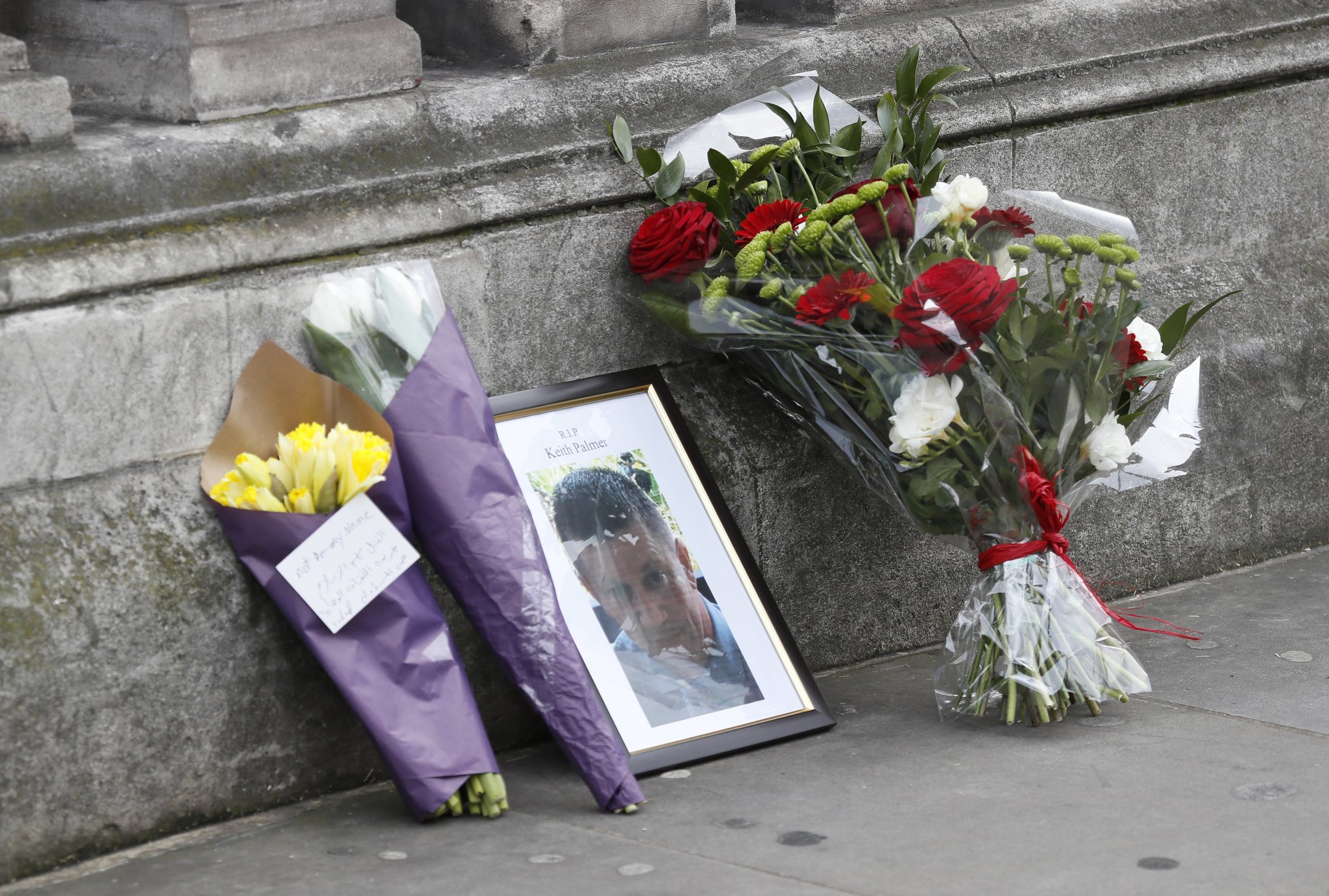 Flowers and a photo of killed police officer Keith Palmer on Whitehall near the Houses of Parliament in London, Thursday March 23, 2017. On Wednesday a knife-wielding man went on a deadly rampage, first driving a car into pedestrians then stabbing a police officer to death before being fatally shot by police within Parliament’s grounds in London. (AP Photo/Kirsty Wigglesworth)