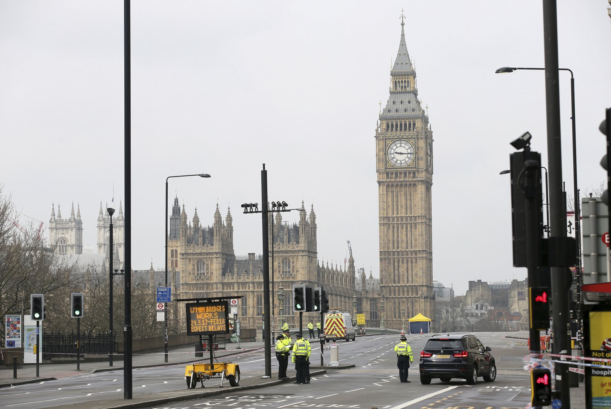 Police work at Westminster Bridge with the Houses of Parliament in background, in London, Thursday March 23, 2017. On Wednesday a knife-wielding man went on a deadly rampage, first driving a car into pedestrians on Westminster Bridge then stabbing a police officer to death before being fatally shot by police within Parliament’s grounds in London. (AP Photo/Tim Ireland)