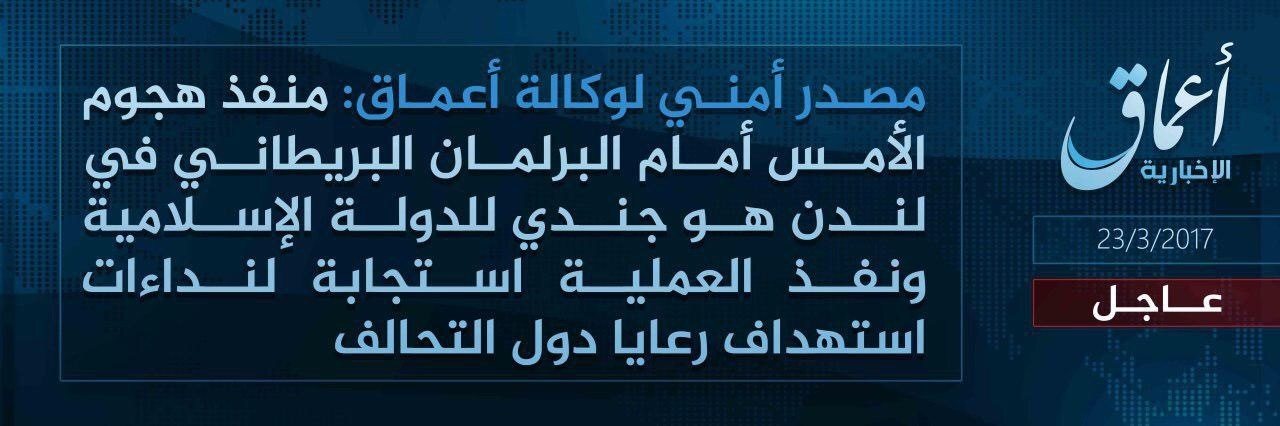 Thus graphic released on Thursday, March 23, 2017 by the Islamic State-linked Aamaq news agency shows a claim of responsibility for an attack on Britain’s Parliament. Arabic reads: “attack in front of the British parliament in London is a soldier of the Islamic State and he carried out the operation in response to calls for targeting citizens of the coalition.” (Aamaq news agency via AP)