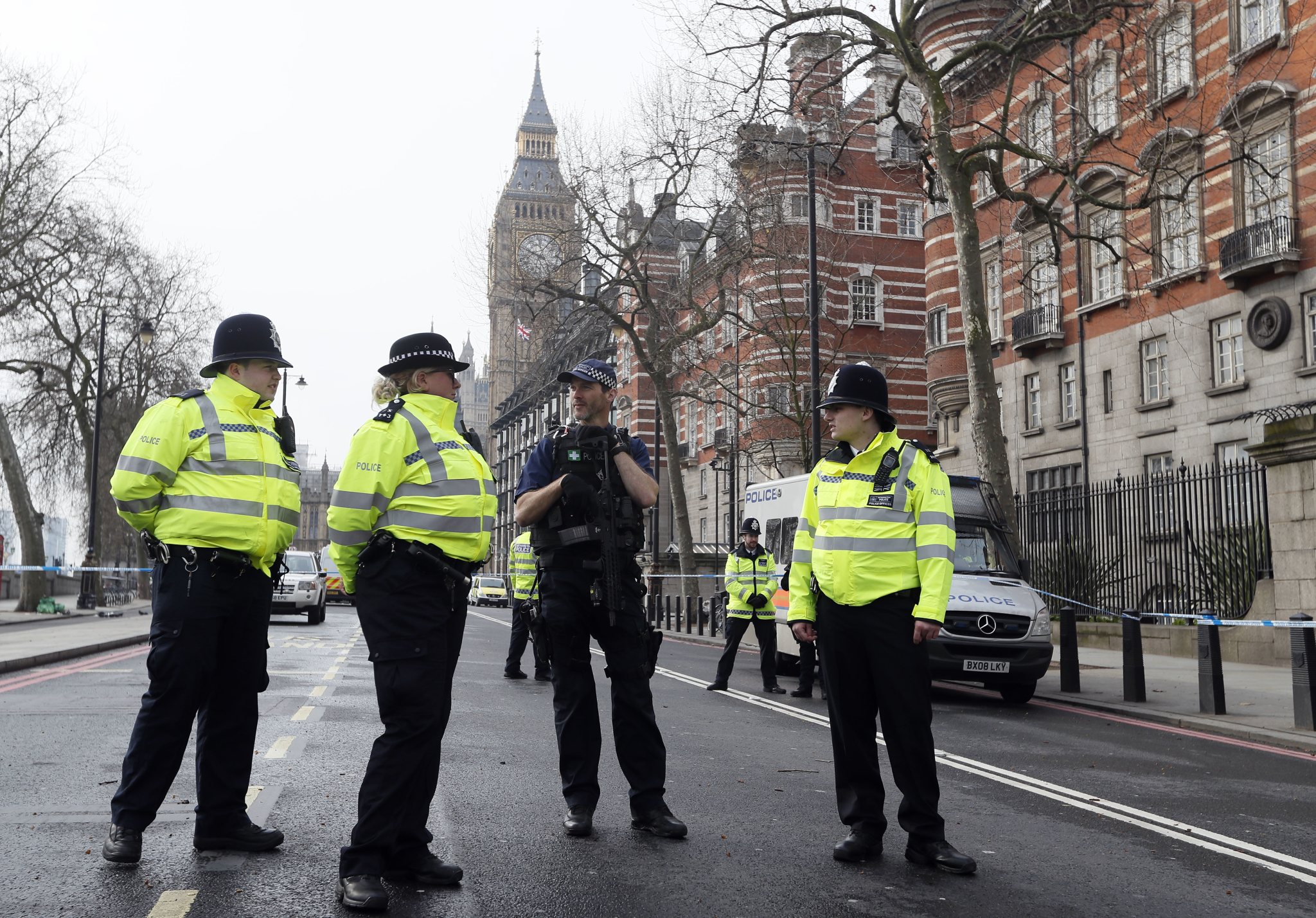 Police officers stand guard on a road leading to the Houses of Parliament in London, Thursday March 23, 2017 on her way to the House of Parliament. On Wednesday a man went on a deadly rampage, first driving a car into pedestrians then stabbing a police officer to death before being fatally shot by police within Parliament’s grounds in London. (AP Photo/Kirsty Wigglesworth)
