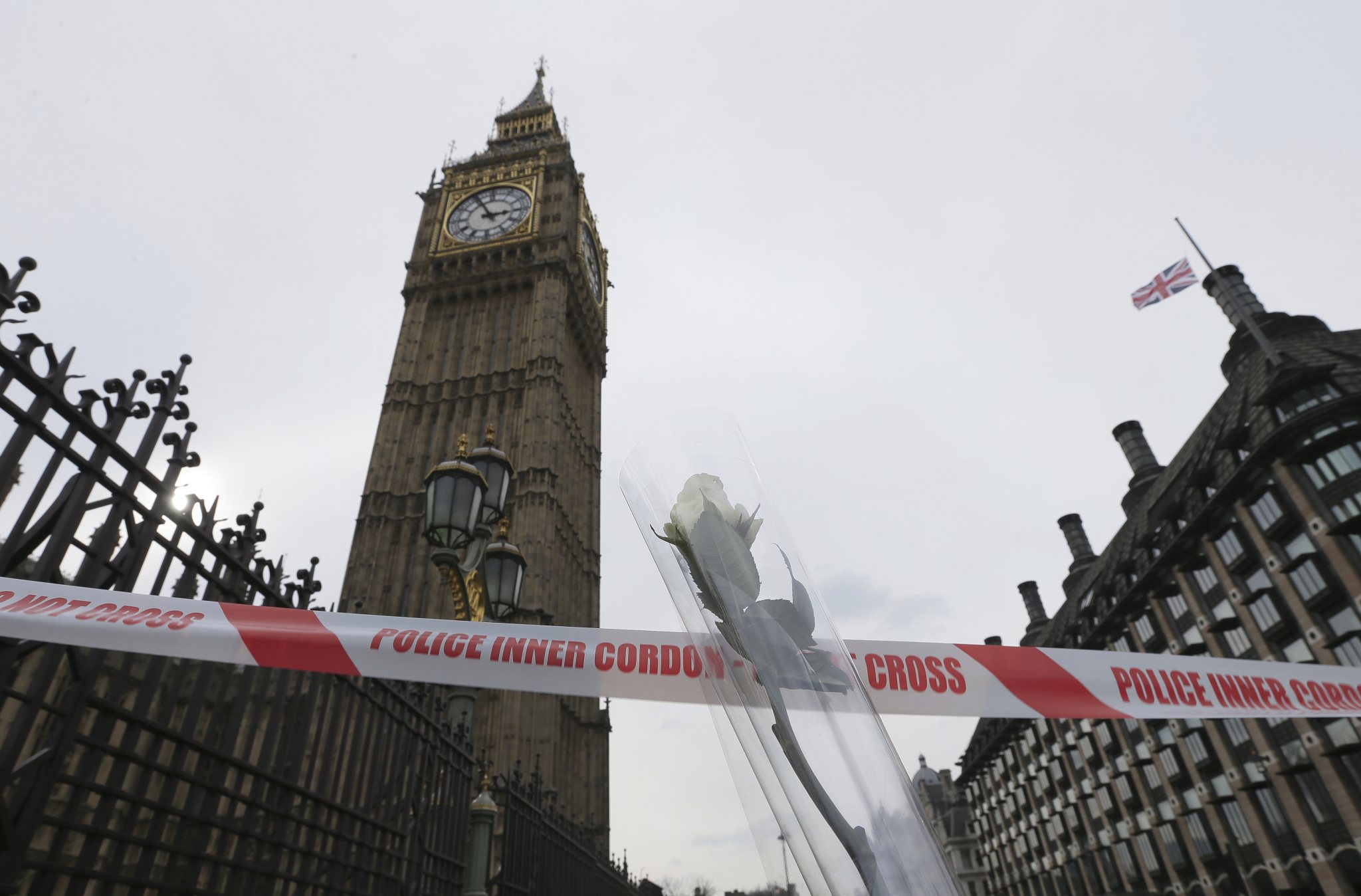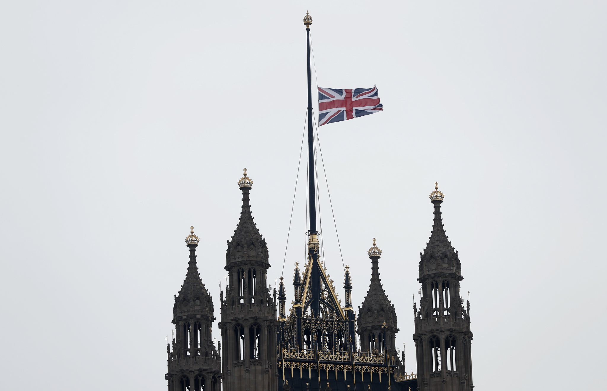 The flag above the Houses of Parliament flies at half mast, the day after a terrorist attack in London, Britain, Thursday March 23, 2017. A knife-wielding man went on a deadly rampage in the heart of Britain’s seat of power Wednesday, plowing a car into pedestrians on London’s Westminster Bridge before stabbing a police officer to death inside the gates of Parliament. Five people were killed, including the assailant. (Jonathan Brady/PA via AP)