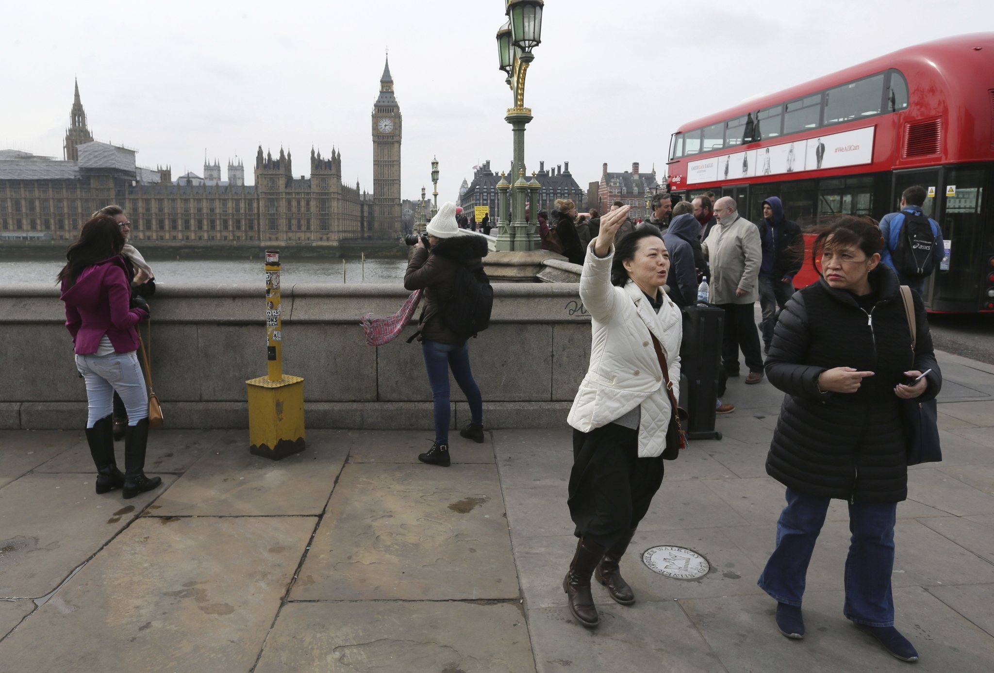 People gather on Westminster Bridge after it was reopened to the public Thursday, March 23, 2017, following an attack on Wednesday when a man drove a car into pedestrians then stabbed a police officer to death before being fatally shot by police within Parliament’s grounds. The IS-linked Aamaq news agency said Thursday that the person who carried out the “attack in front of the British parliament in London was a soldier of the Islamic State.” (AP Photo/Tim Ireland)