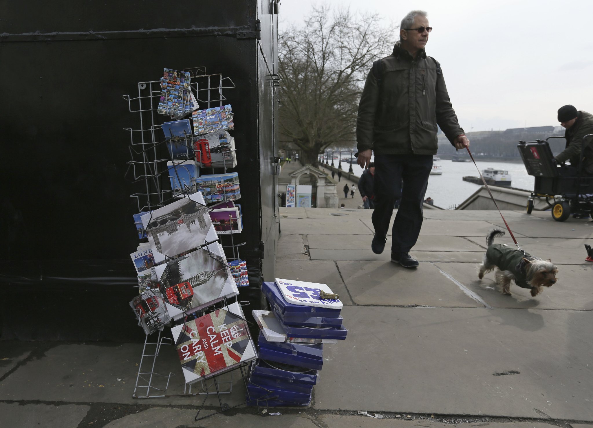 A man and his dog walk past a souvenir stall on Westminster Bridge after it was reopened to the public Thursday, March 23, 2017, following an attack on Wednesday when a man drove a car into pedestrians then stabbed a police officer to death before being fatally shot by police within Parliament’s grounds. The IS-linked Aamaq news agency said Thursday that the person who carried out the “attack in front of the British parliament in London was a soldier of the Islamic State.” (AP Photo/Tim Ireland)