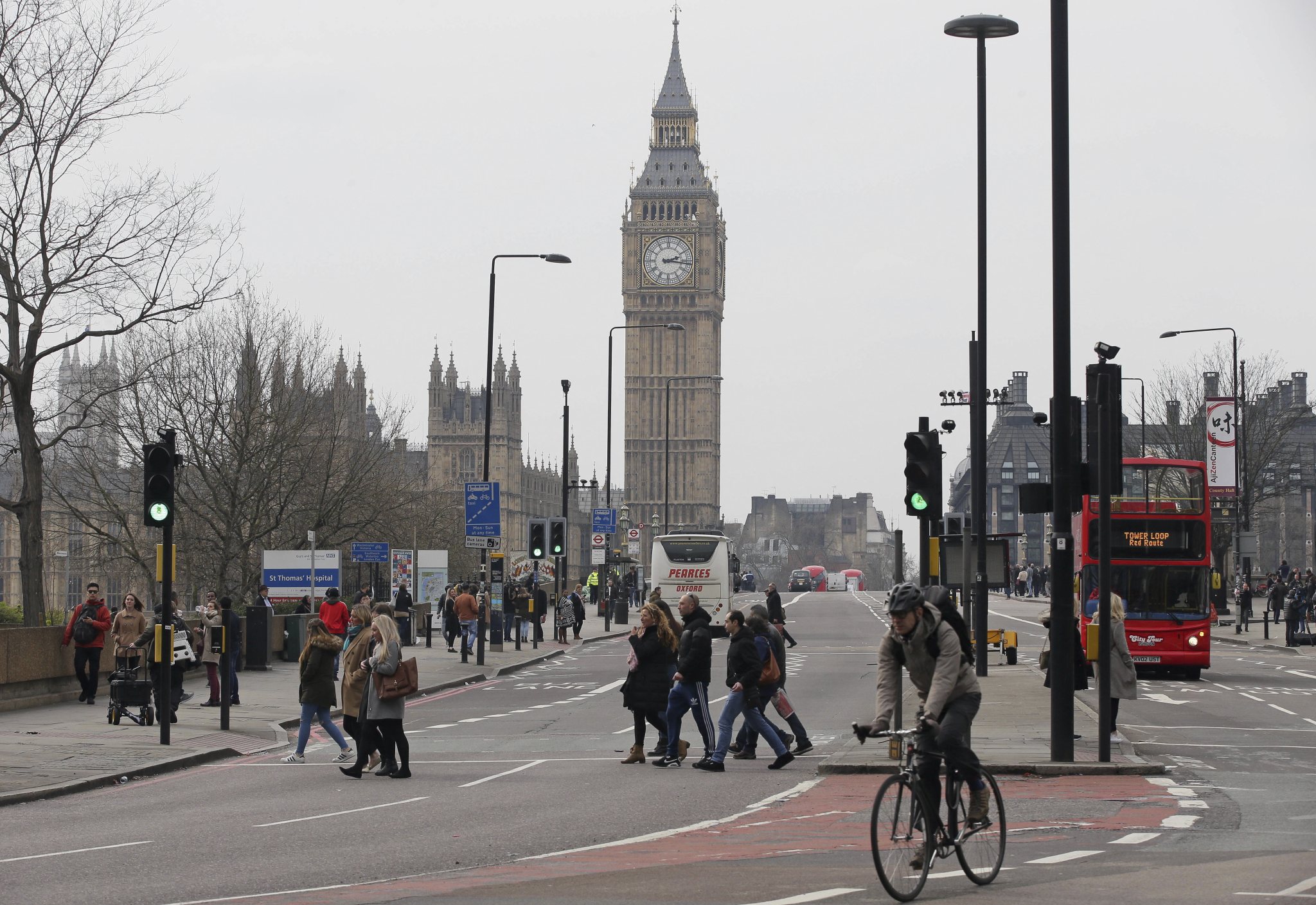 People and vehicles cross Westminster Bridge after it was reopened to the public Thursday, March 23, 2017, following an attack on Wednesday when a man drove a car into pedestrians then stabbed a police officer to death before being fatally shot by police within Parliament’s grounds. The IS-linked Aamaq news agency said Thursday that the person who carried out the “attack in front of the British parliament in London was a soldier of the Islamic State.” (AP Photo/Tim Ireland)
