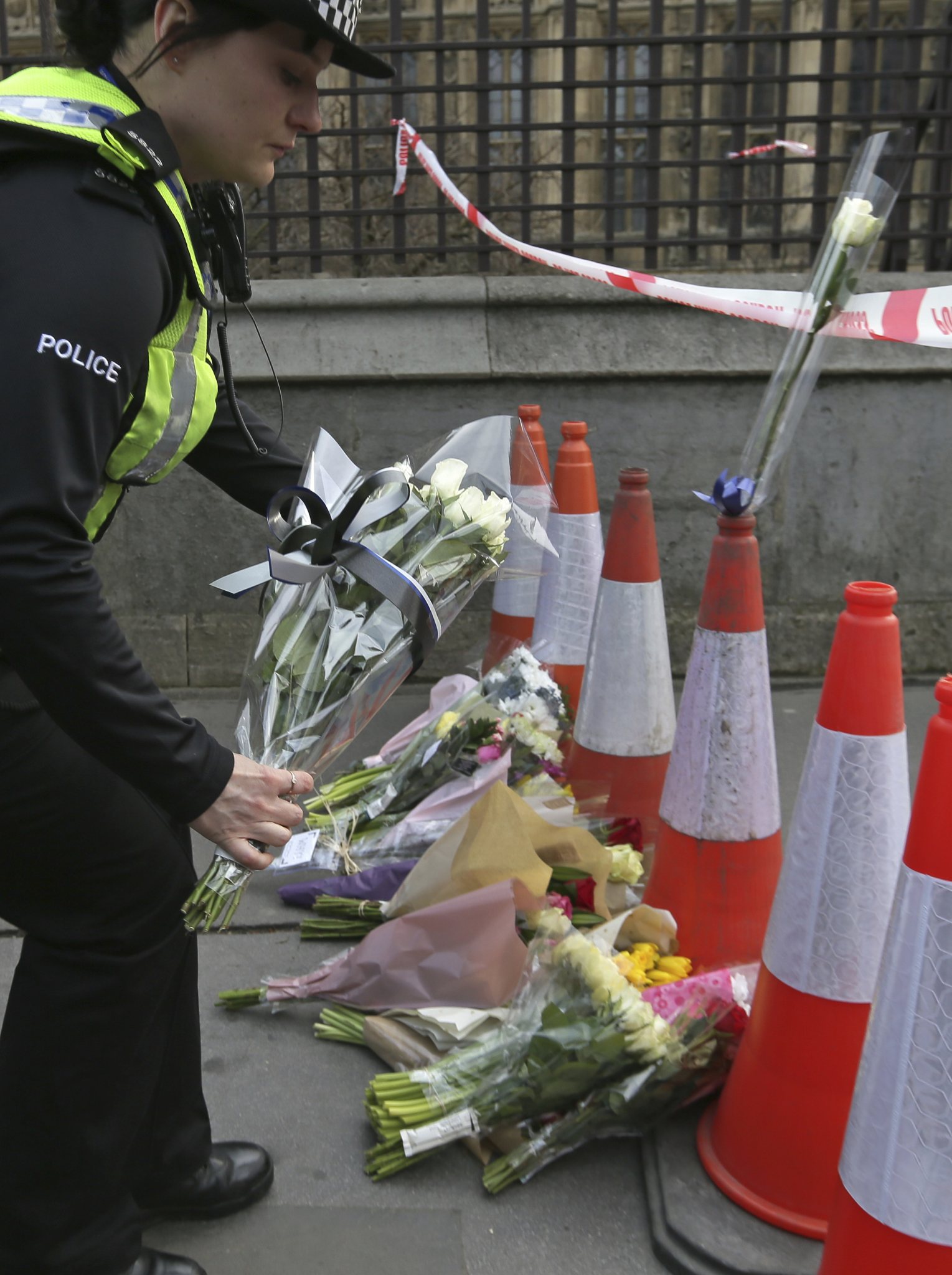 A police officer lays flowers as part of a floral tribute to the victims of Wednesday’s attack placed near the Houses of Parliament in London, Thursday March 23, 2017. On Wednesday a knife-wielding man went on a deadly rampage, first driving a car into pedestrians then stabbing a police officer to death before being fatally shot by police within Parliament’s grounds in London. (AP Photo/Tim Ireland)