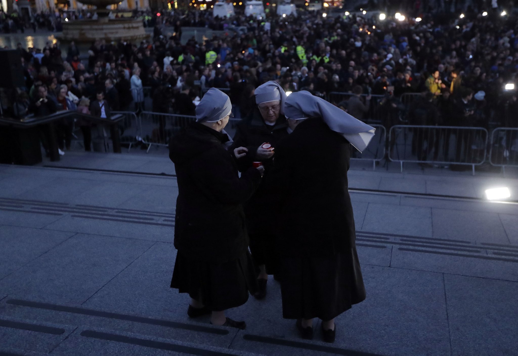 A group of nuns light candles at a vigil for the victims of Wednesday’s attack, at Trafalgar Square in London, Thursday, March 23, 2017. The Islamic State group has claimed responsibility for an attack by a man who plowed an SUV into pedestrians and then stabbed a police officer to death on the grounds of Britain’s Parliament. Mayor Sadiq Khan called for Londoners to attend a candlelit vigil at Trafalgar Square on Thursday evening in solidarity with the victims and their families and to show that London remains united. (AP Photo/Matt Dunham)