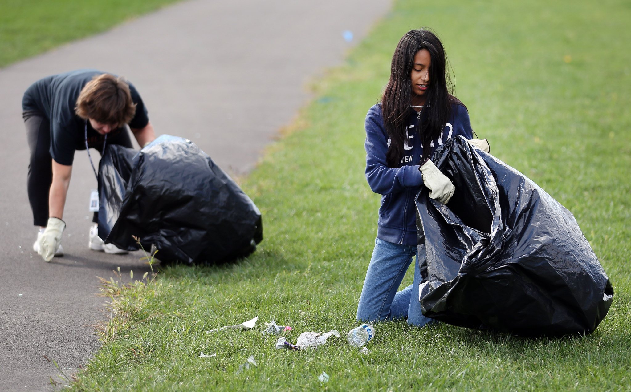 Students at Carl Sandburg Middle School in Mundelein spent Tuesday afternoon picking up garbage around the school as part of a community service club project.