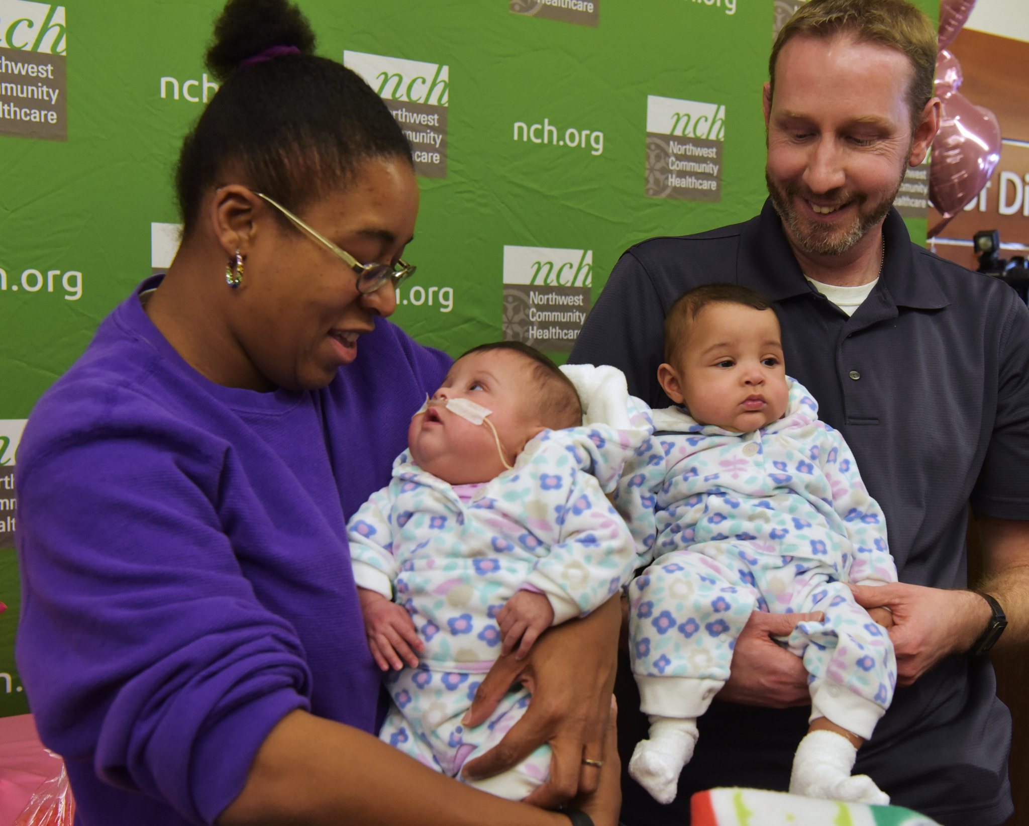 Kacie is the smallest premature baby ever born in the 57-year history of Northwest Community Hospital in Arlington Heights, where Mom and Dad and twin sister Naomi came to visit daily until Kacie was healthy enough to go home with them Thursday.