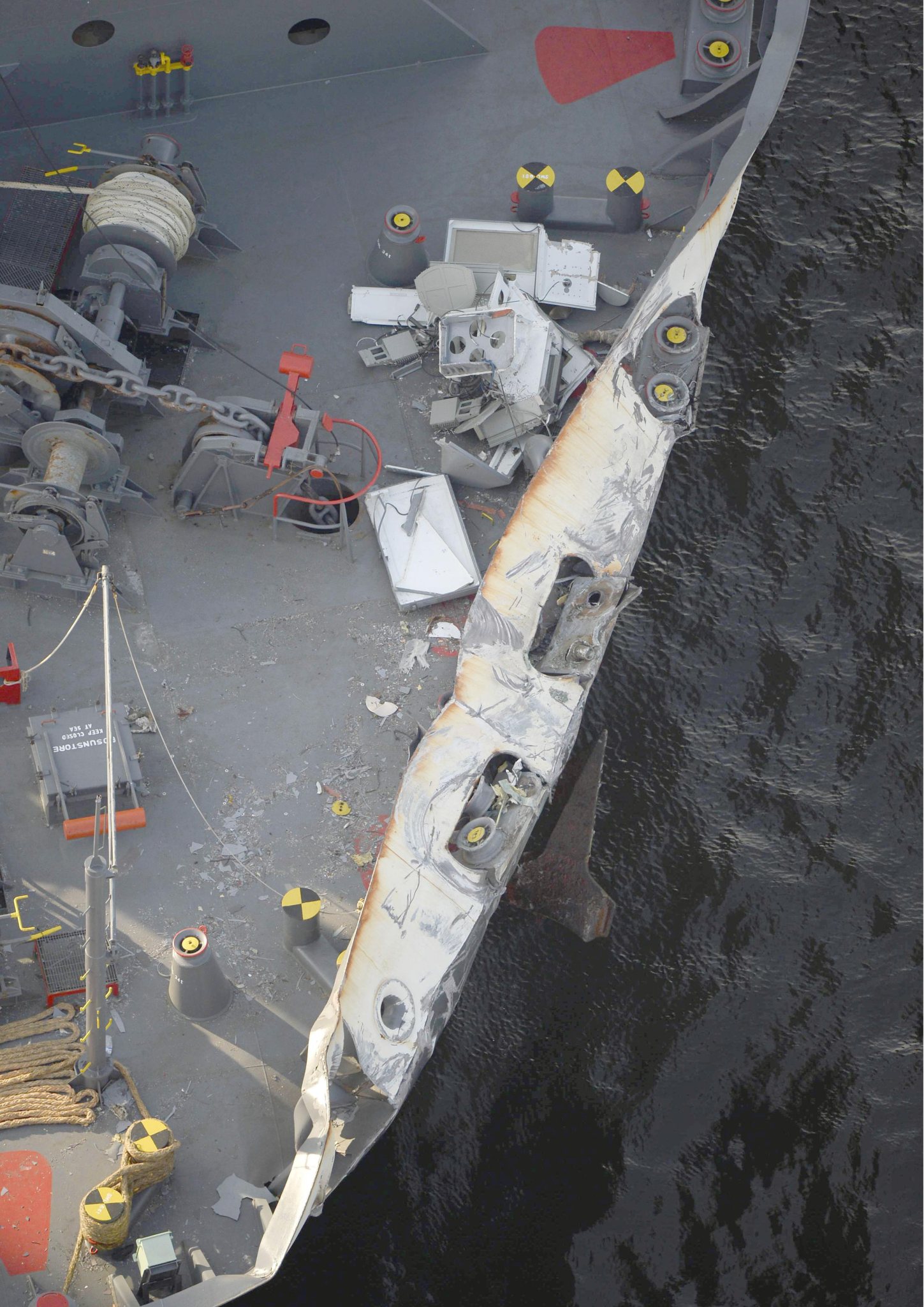 Vice Adm. Joseph Aucoin, the commander of the 7th Fleet, described a harrowing scene as other sailors fought to keep the ship from sinking. Most of the damage is below the waterline, including a large gash near the keel, Aucoin said.