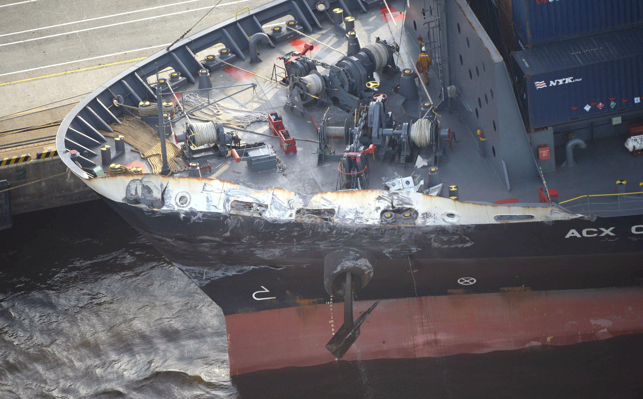 The container ship’s left bow was dented and scraped, and accident investigators from the Japanese transport ministry found further damage below its waterline. Footage from Japanese broadcaster NHK showed a sharp horizontal cut across the bow area, which looked like a shark’s mouth. Many scratches were also seen in the frontal area.