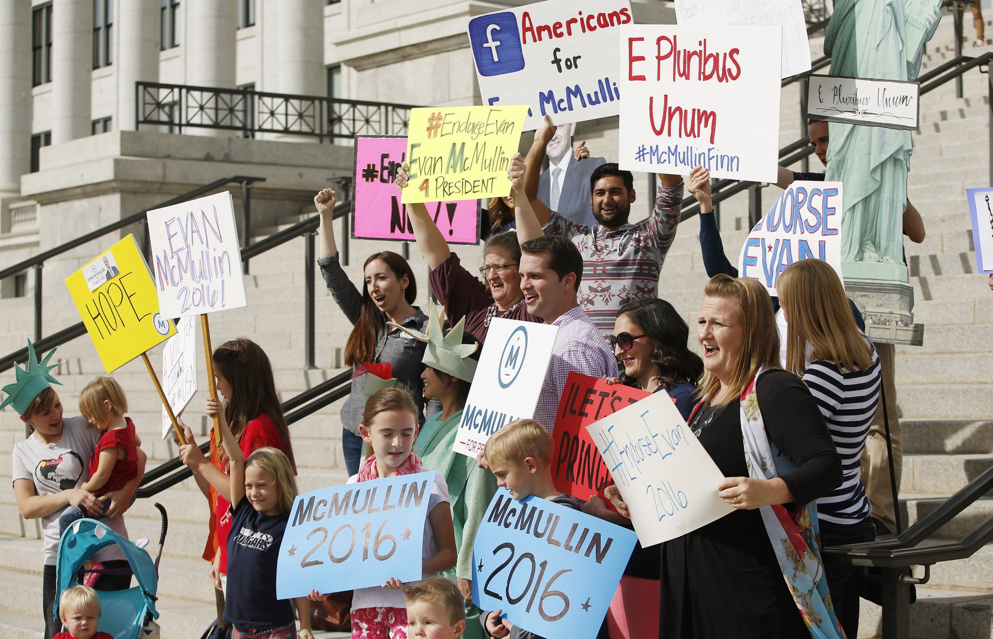 Cecil and Tiffany Sullivan, teachers from a Salt Lake City suburb of Murray, came with their infant son holding a sign, “#Evan Help Us.” It was the couple’s fourth McMullin rally they’ve attended since they decided he would be their choice.