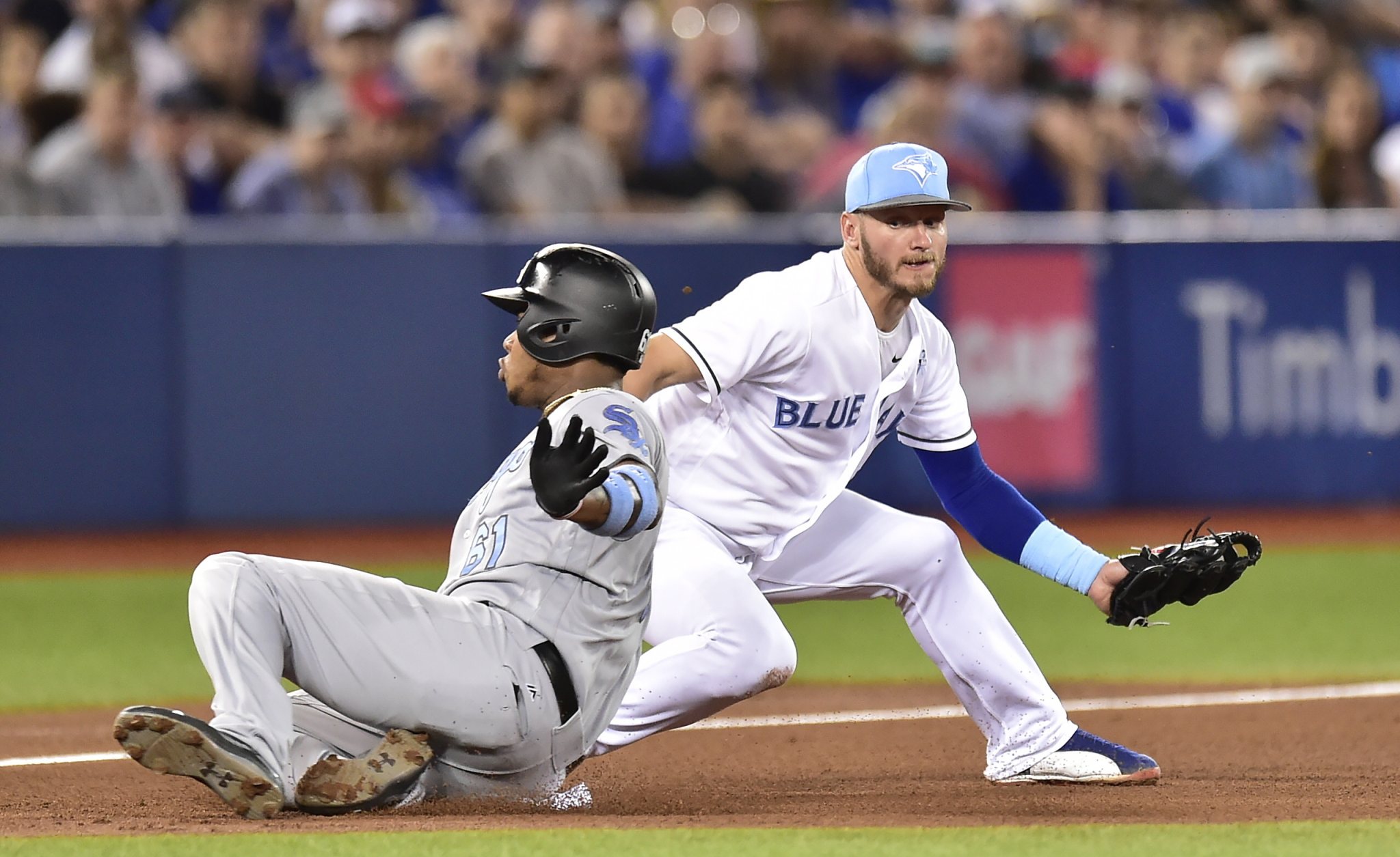 Ryan Goins’ first triple of the season two batters later drove in the winning run.