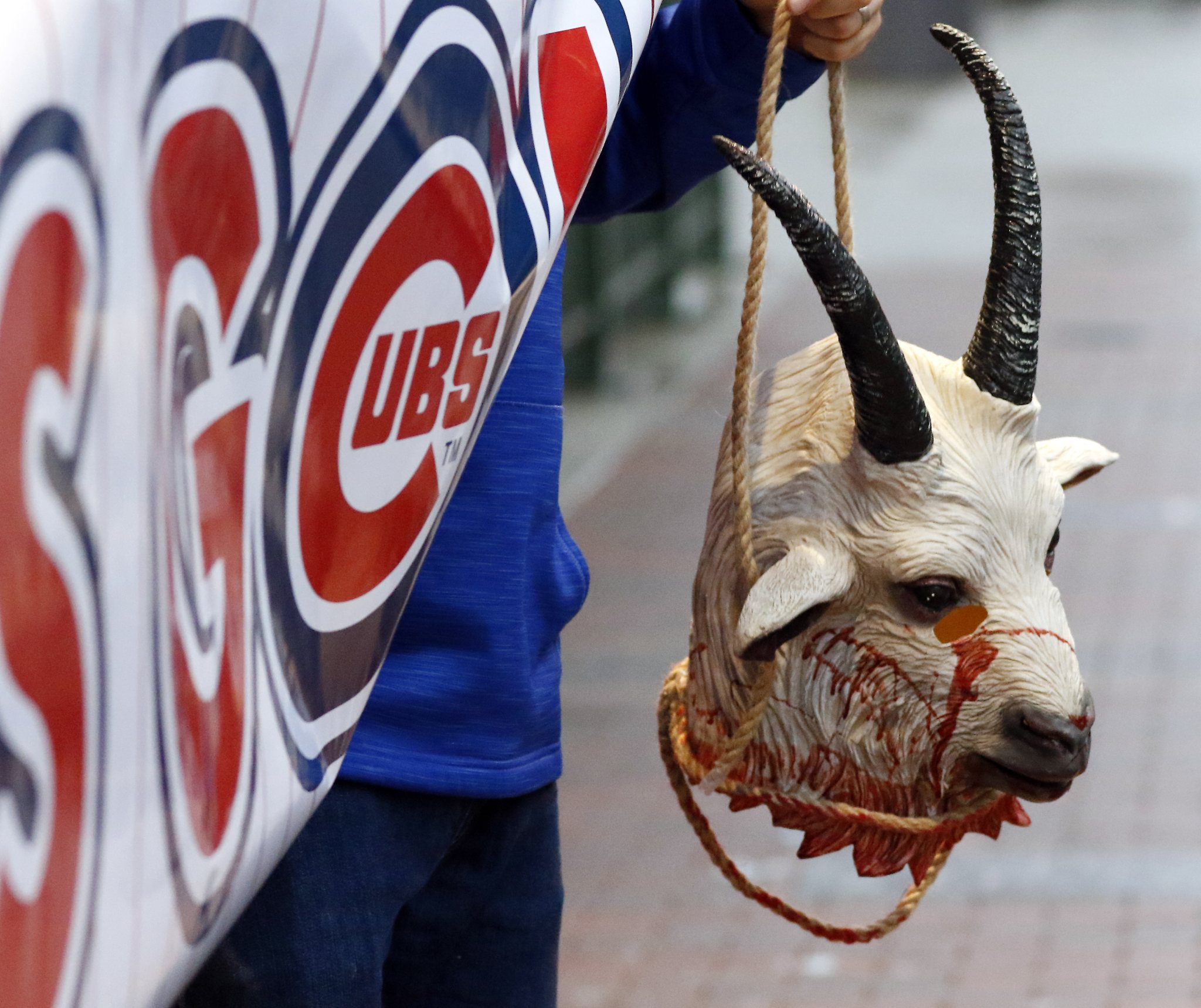 Andrea Marcellis of Villa Park came to Wrigley with her husband and some friends Wednesday carrying a giant “Let’s Go Cubs” sign and a bloody rubber goat head in hopes of breaking the infamous North Side curse.