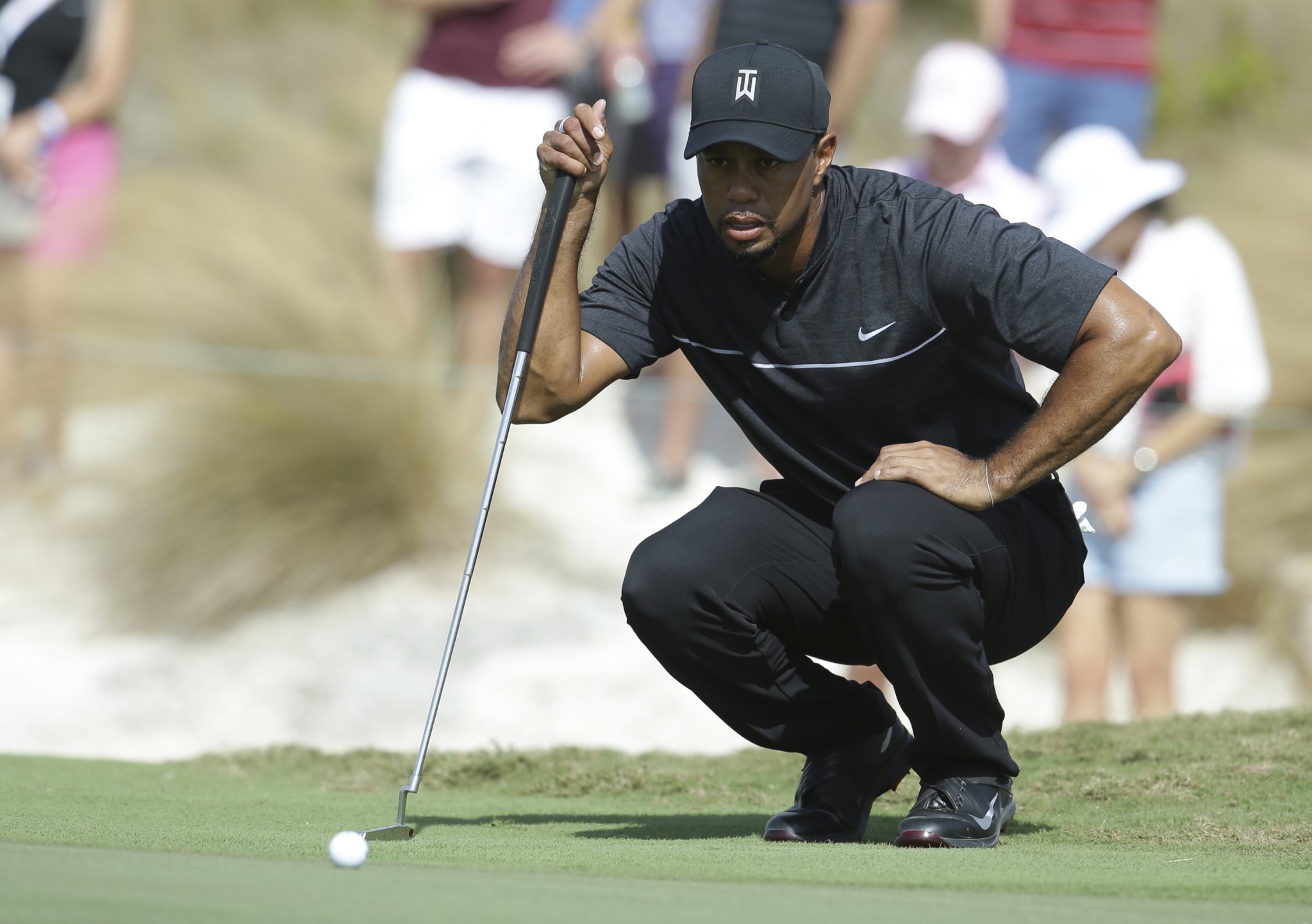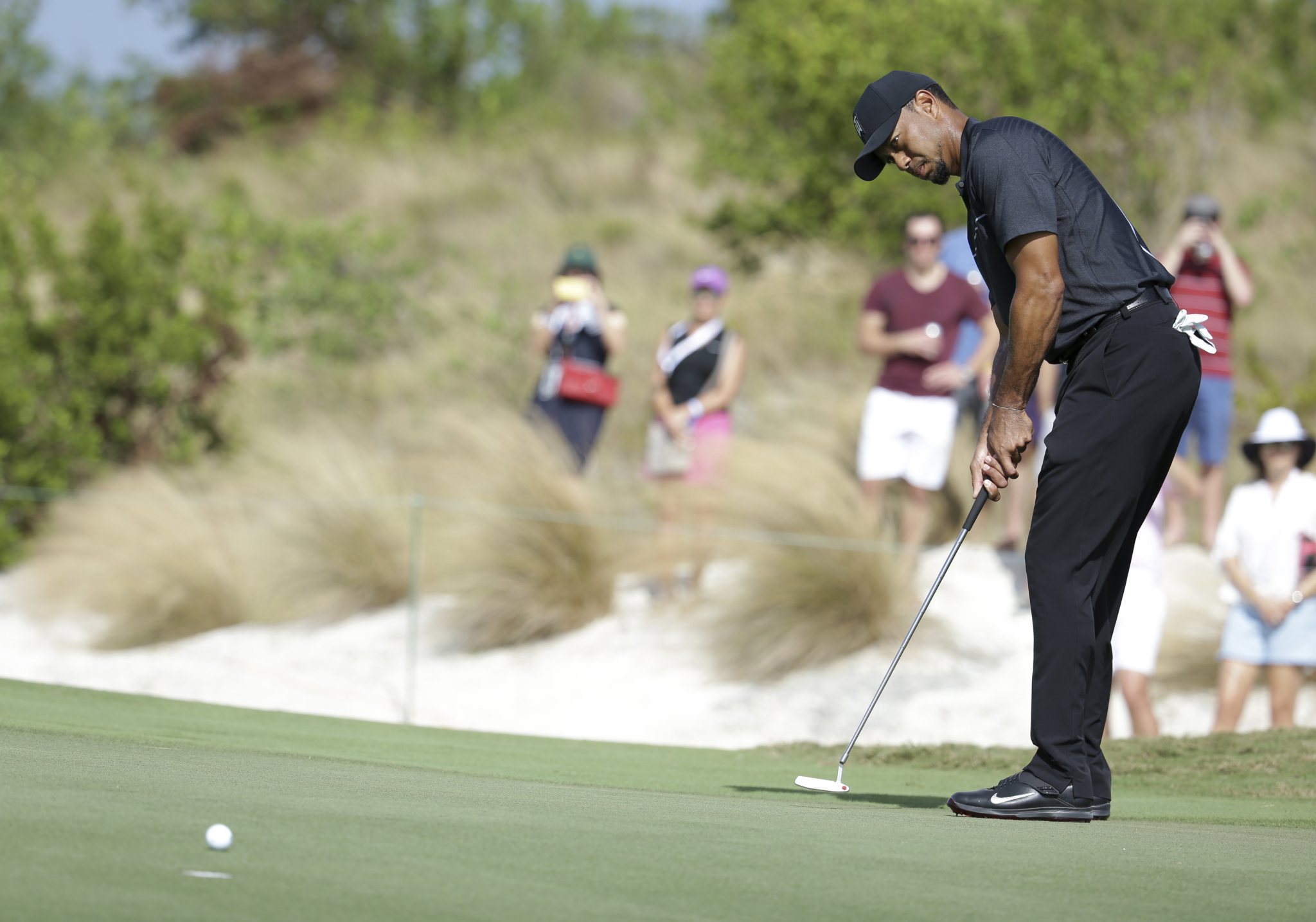 He answered a few questions early, not only with a 342-yard drive with a strong tropical breeze at his back, but with a tight draw. Woods went over the back of the third green and faced a 30-yard pitch. That came off perfectly, checking and rolling out to 2 feet for a birdie.