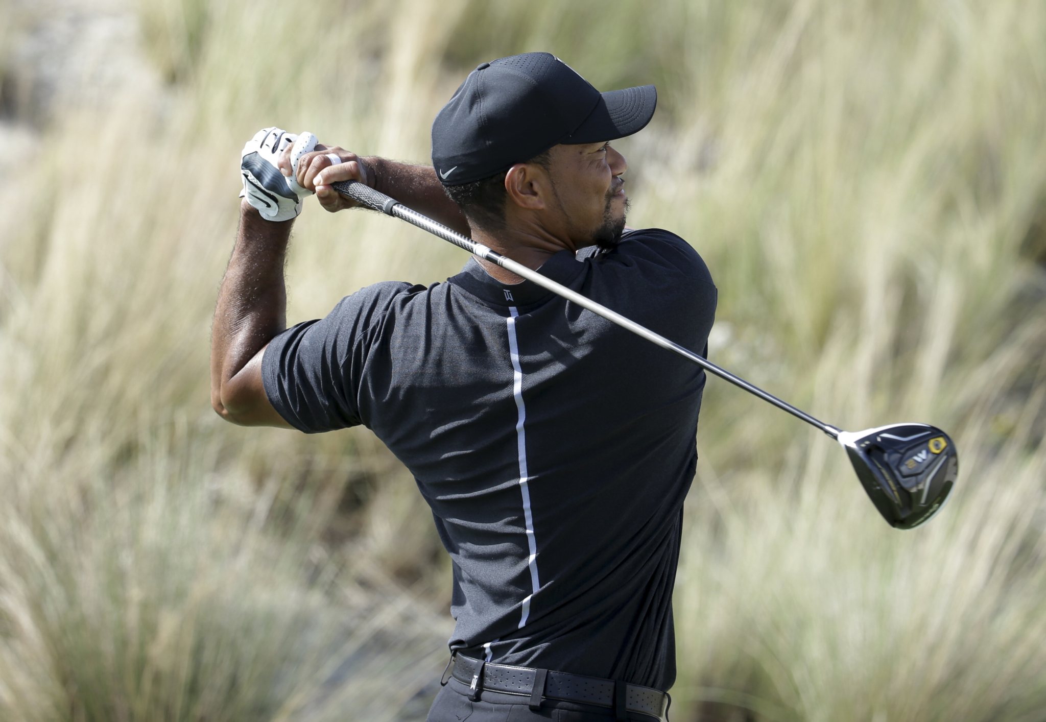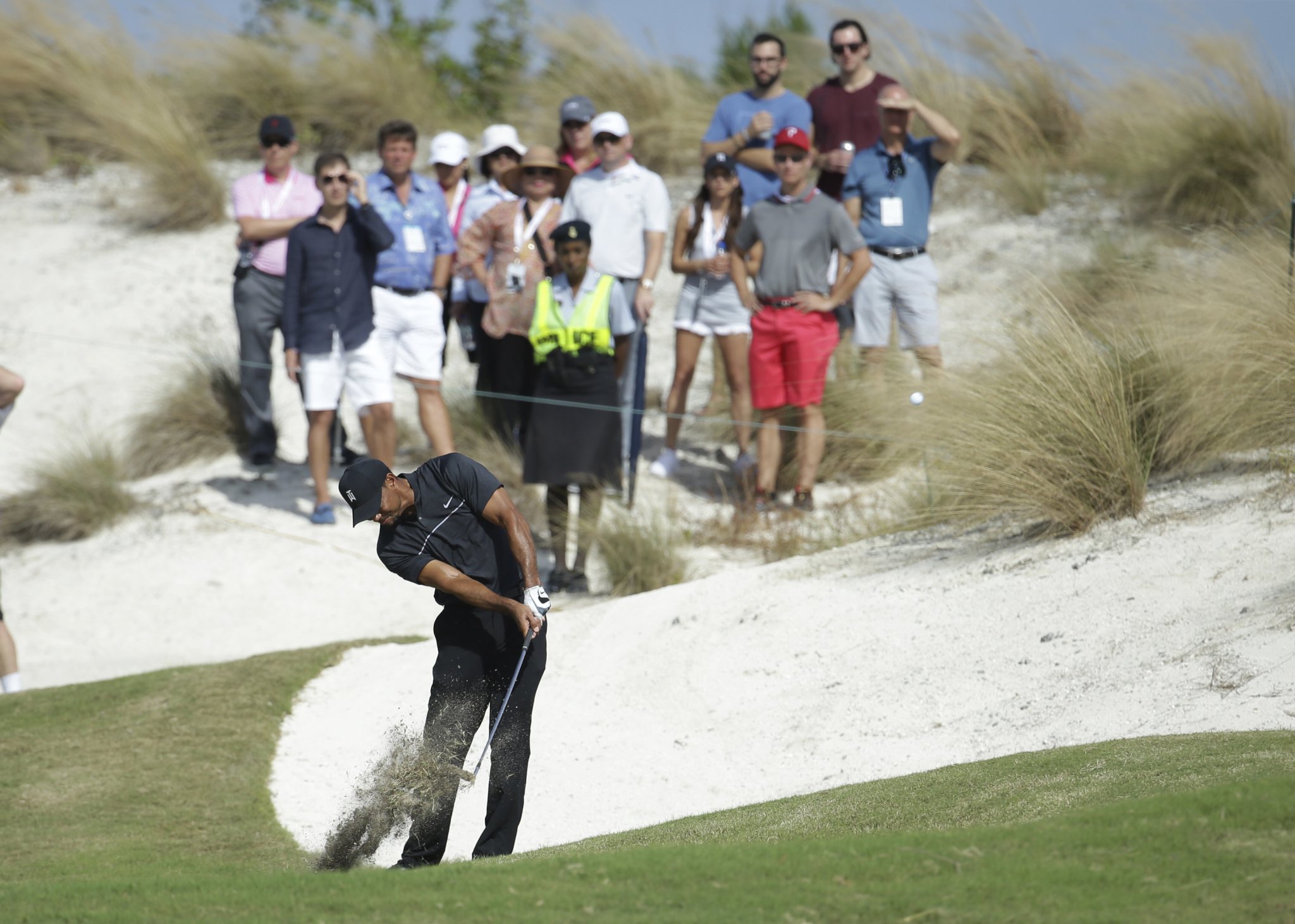 He ended the front nine with a tee shot that went no more than a yard into the dunes, leaving him such an awkward lie that he had a hard time keeping his feet from slipping. He got it back into the fairway, came up short and left of the green, and flubbed his pitch. The ball rolled back down the slope, and Woods pitched the next one to just outside 3 feet and made that for bogey.